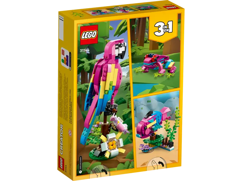 Dzięki zestawowi LEGO® Creator 3 w 1 Egzotyczna różowa papuga (31144) mali budowniczowie i wielbiciele zwierząt w wieku od siedmiu lat wybiorą się w emocjonującą podróż do lasu deszczowego. Zestaw zawiera różowo-niebieską papugę, która może obracać ciało, siedząc na gałęzi, a także poruszać skrzydłami i ogonem.