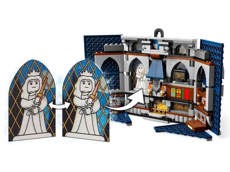 Fani mogą zademonstrować swoją dumę z przynależności do Ravenclawu™ dzięki fladze domu LEGO® Harry Potter™ (76411). Zestaw zawiera płytkę z nadrukiem z herbem Ravenclawu i wieszak do powieszenia na ścianie. Zbudowana z klocków flaga otwiera się, ukazując szczegółowo odtworzony wielki pokój wspólny Ravenclawu ze stołem, książką, dwoma krzesłami i dwoma lampami oraz diademem Roweny Ravenclaw. Wsuwana soczewkowa tablica tworzy magiczne efekty 3D, takie jak iluzja głębi widoku przez okna i migoczące płomienie w kominku. Ożyw scenę za pomocą minifigurek Cho Chang™, Luny Lovegood™ i Michaela Cornera oraz chochlika kornwalijskiego.