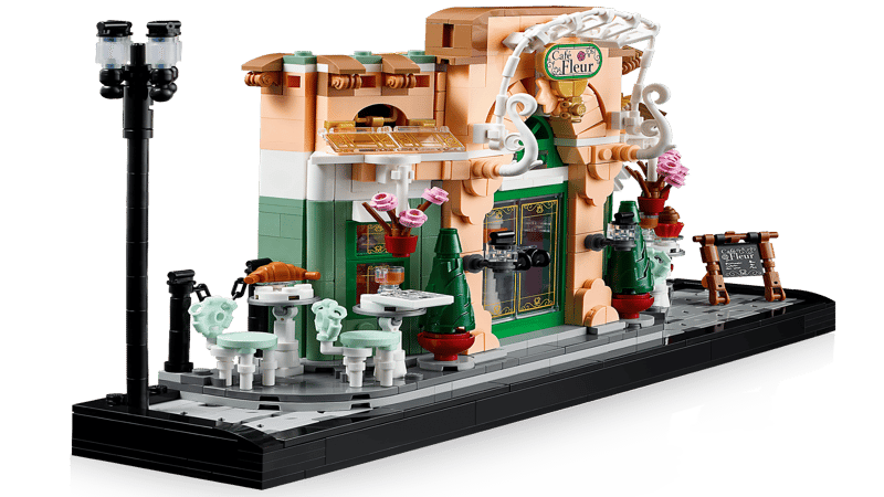 Chodnik z klasyczną latarnią uliczną dodaje francuskiego klimatu, a całości dopełniają malownicza fasada, zdobne meble, wiszące doniczki i podwójne drzwi, które prowadzą do przytulnego wnętrza z tapetą i meblami z ciemnego drewna. Ten model, pełen misternych detali i akcesoriów, takich jak rogaliki, kubki, gazeta i kasa, oddaje istotę klasycznego francuskiego bistro, a jego smukły profil i płaski tył sprawiają, że idealnie nadaje się do ustawienia na półce.