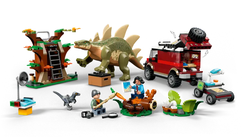 Dzięki zestawowi Dinomisje: odkrycie stegozaura (76965), który świetnie sprawdzi się jako prezent inspirujący do odgrywania ról, na sześciolatków i starsze dzieci czekają niesamowite przygody. Po zbudowaniu zestawu LEGO® Jurassic World dzieci mogą wymyślać rozmaite historie, korzystając z figurki stegozaura z ruchomymi nogami, małej figurki welociraptora oraz minifigurek Bena i Sammy. W zestawie jest też drzewo z platformą obserwacyjną i dwiema odłączanymi sekcjami, a także terenówka z miejscem dla dwóch minifigurek, zdejmowanym dachem, otwieranym tyłem, ruchomą przestrzenią ładunkową i wieloma schowkami na akcesoria. W zestawie jest także mała przyczepa z ruchomą anteną satelitarną, mikroskopem i ekranami oraz wieloma innymi dodatkami.