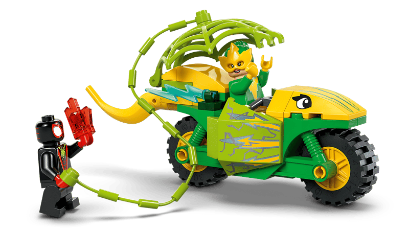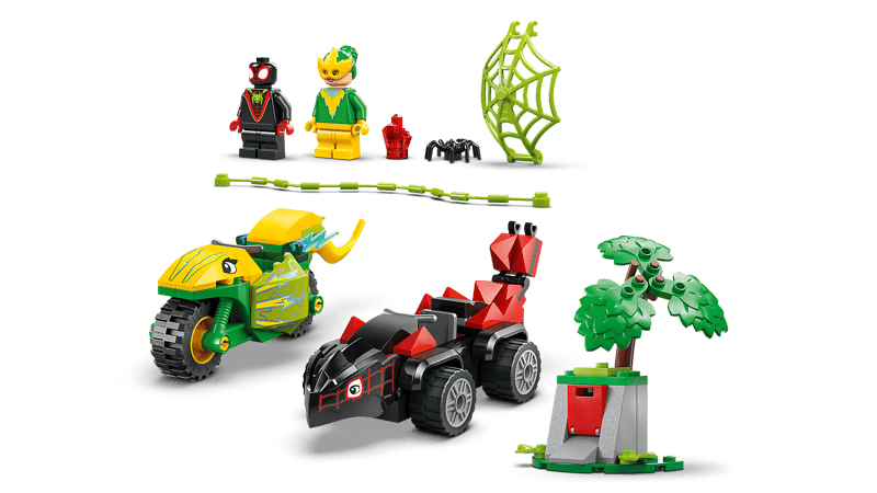 Zestaw pozwala odtwarzać sceny z serialu Spidey i super-kumple. Zawiera dwie minifigurki superbohaterów i dwa dinopojazdy do popychania: Miles „Spin” Morales w samochodzie w kształcie stegozaura i Electro na motocyklu w kształcie dilofozaura. Duży element z siecią, kryształ ukryty w skale oraz akcesoria z tłem inspirują dzieci do kreatywnej zabawy w odgrywanie ról. Każda torebka w pudełku zawiera klocki i duży klocek startowy do szybkiego zbudowania modelu i postaci, dzięki czemu zabawa zaczyna się szybko. Do zestawu dołączone są intuicyjne instrukcje w formie kolorowego przewodnika z ilustracjami.