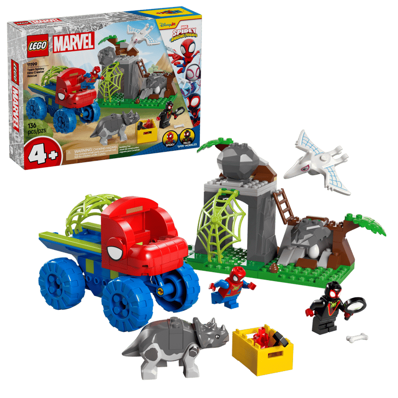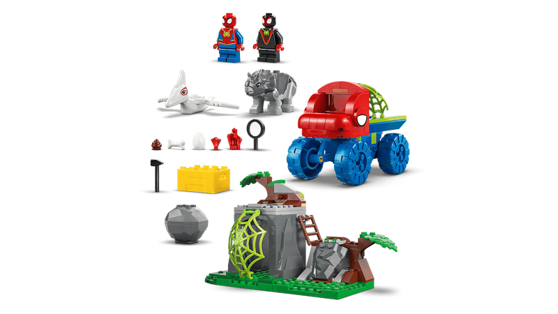 Ten zestaw LEGO® do zbudowania zawiera minifigurki Spidey’ego i Milesa „Spina” Moralesa oraz dwie figurki dinozaurów: Ghost-Spider jako pterodaktyl i Rhino jako triceratops. W zestawie jest też dinoterenówka z dużą pajęczyną przymocowaną z tyłu, uruchamiana przełącznikiem funkcja spadającej skały, jajo dinozaura do odkrycia i pajęczyna, którą można opuścić, by uwięzić złoczyńcę. W zestawie znajdują się intuicyjne instrukcje w formie kolorowego przewodnika z ilustracjami, a osobne torebki zawierają klocki i duży klocek startowy, dzięki czemu budowanie jest szybkie i łatwe.