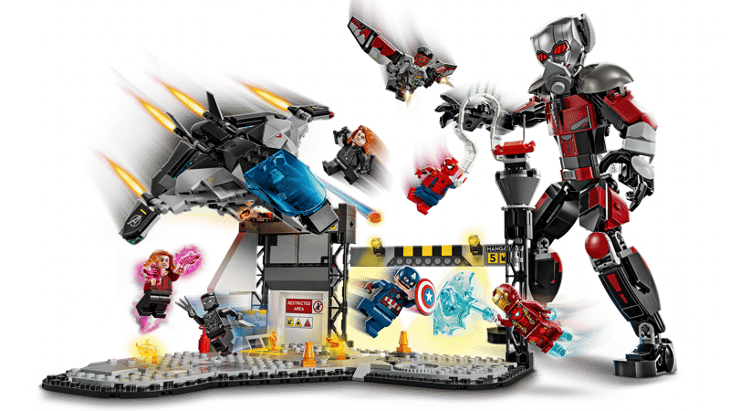 Ten zestaw jest oparty na scenie bitwy na lotnisku z filmu Kapitan Ameryka: Wojna bohaterów Marvel Studios. Zawiera osiem figurek — Kapitana Amerykę, Zimowego Żołnierza, Wandę, Falcona, Iron Mana,Spider-Mana, Czarną Wdowę i Czarną Panterę — z bronią i akcesoriami, a także w pełni ruchomego Ant-Mana o wysokości 24 cm. Samolot Quinjet ma składane skrzydła i otwierany kokpit, w którym mieści się minifigurka pilota. Akcję urozmaica dodatkowo funkcja wybuchającej beczki wbudowana w scenerię lotniska. Dzieci mogą przybliżać i obracać model podczas budowania za pomocą cyfrowej aplikacji LEGO Builder.