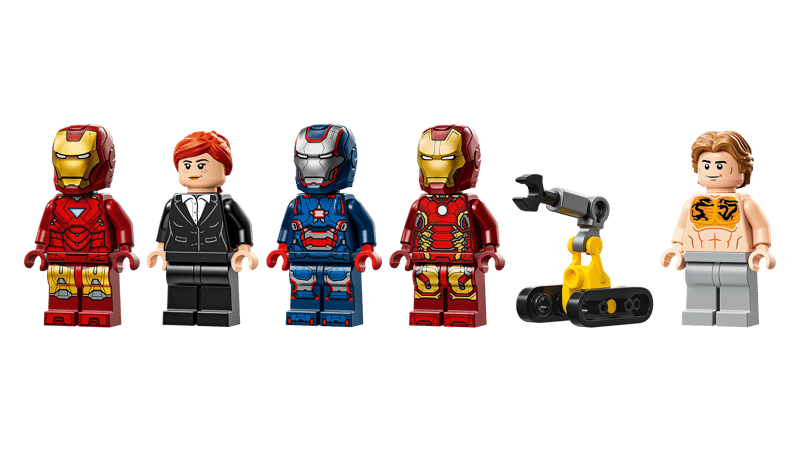 Zestaw LEGO ǀ Marvel zawiera trzy kapsuły ze zbrojami i trzy minifigurki zbroi Iron Mana: MK1, MK43 i MK6. Całość uzupełniają minifigurki Pepper Potts i złoczyńcy Aldricha Killiana, robota Dum-E i dużego mecha Igora MK3 z ruchomymi ramionami i nogami oraz kokpitem z miejscem na minifigurkę. Inne funkcje obejmują platformę serwisową z dwoma robotycznymi ramionami i dużym urządzeniem skanującym. Jest też gaśnica i dwa elementy imitujące ogień oraz dwa miotacze klocków do odgrywania bitew. Dodatkową cyfrową zabawę zapewnia intuicyjna aplikacja LEGO Builder, w której można powiększać modele, obracać je w 3D i śledzić swoj e postępy. Zestaw zawiera 384 elementów.