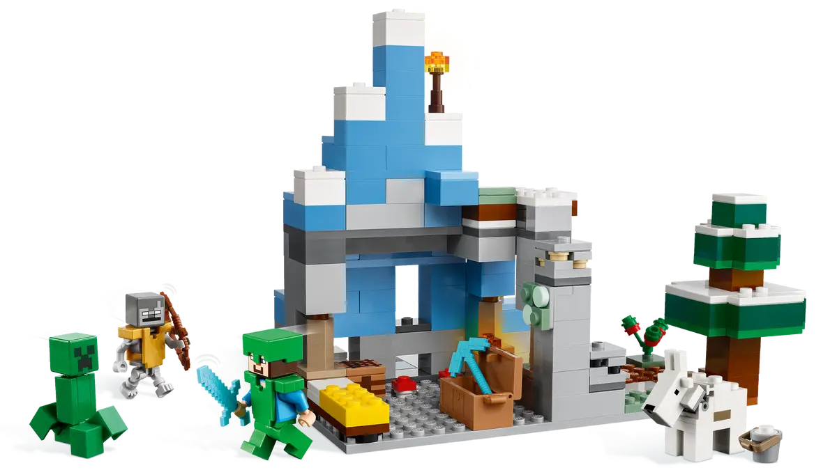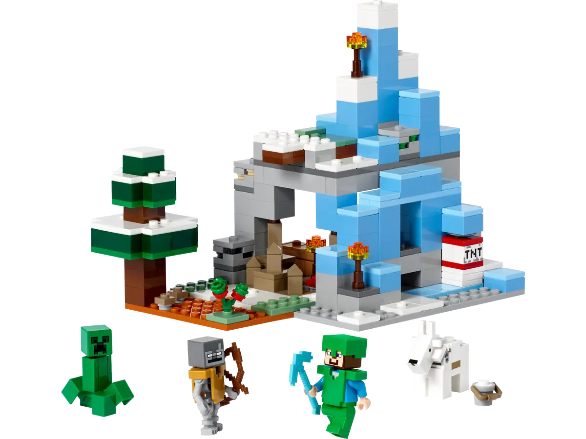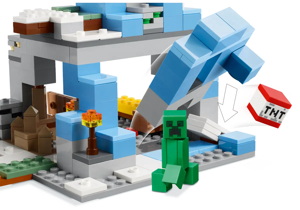 Gracze w Minecrafta rozpoznają ośnieżone szczyty i tajgę i z chęcią wykorzystają swoje umiejętności z gry, by wydobyć węgiel, żelazo i szmaragdy leżące pod lodem. Dzieci muszą zbudować bezpieczną bazę i zebrać jedzenie, zanim zaczną kopać. Gdy kultowe moby, Creeper™ i tułacz, podejdą za blisko, dzieci mogą uciec niebezpieczną jaskinią naciekową, użyć dynamitu, by wysadzić górę i dotrzeć do bazy lub pokierować kozą i zrzucić moby z klifu! Inne funkcje i akcesoria zapewnią niekończącą się zabawę rodem z Minecrafta. Dodatkową cyfrową rozrywkę zapewni aplikacja LEGO Builder, w której można powiększać i obracać model podczas budowania.