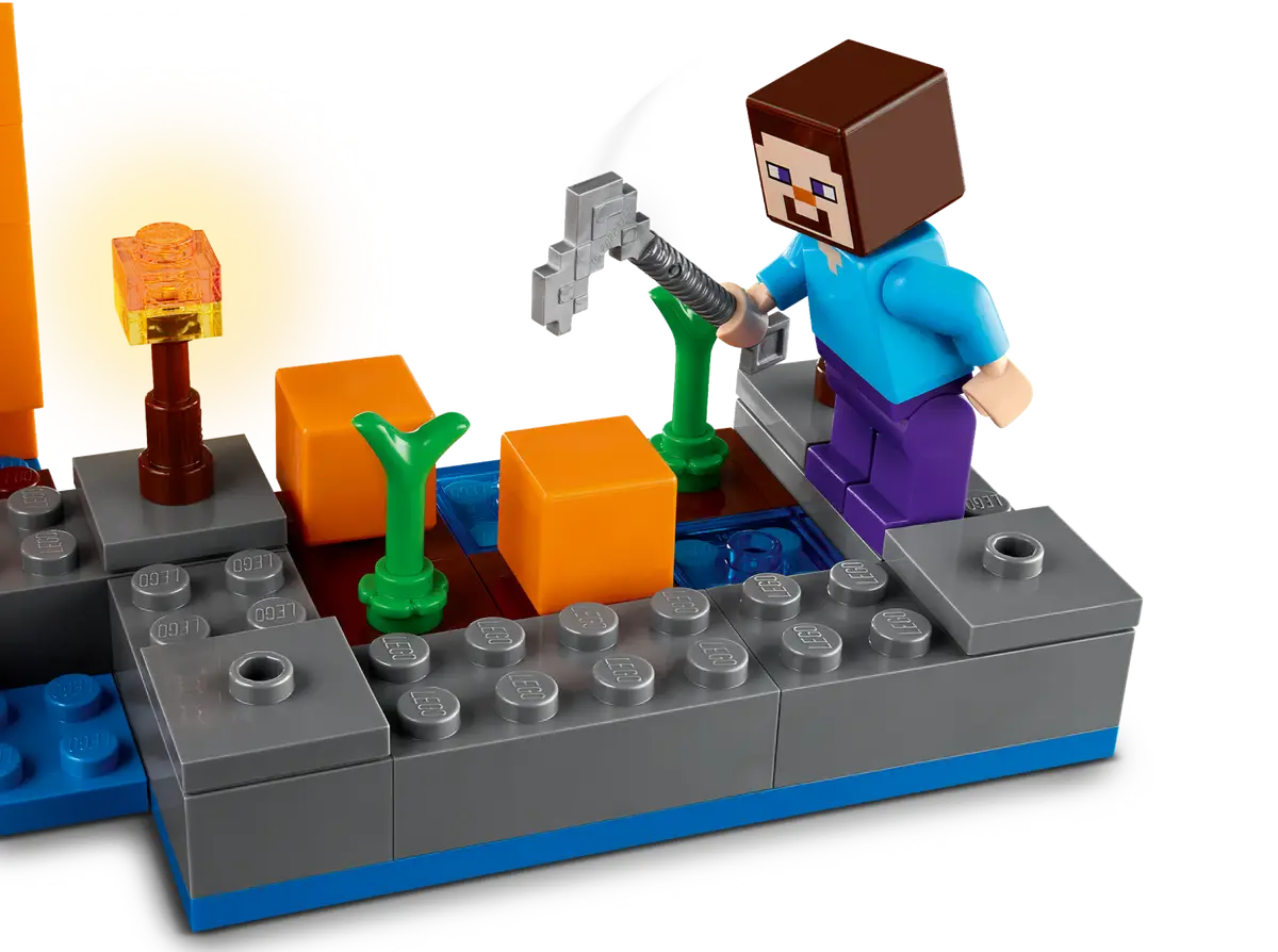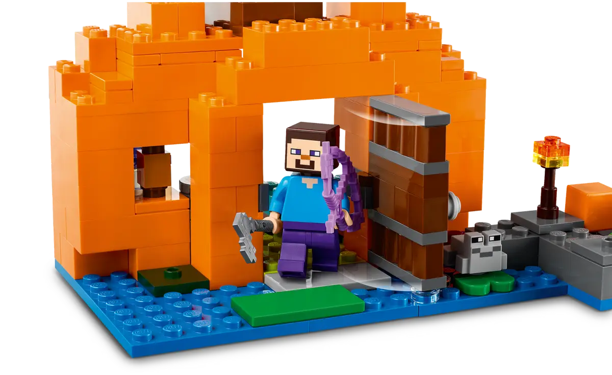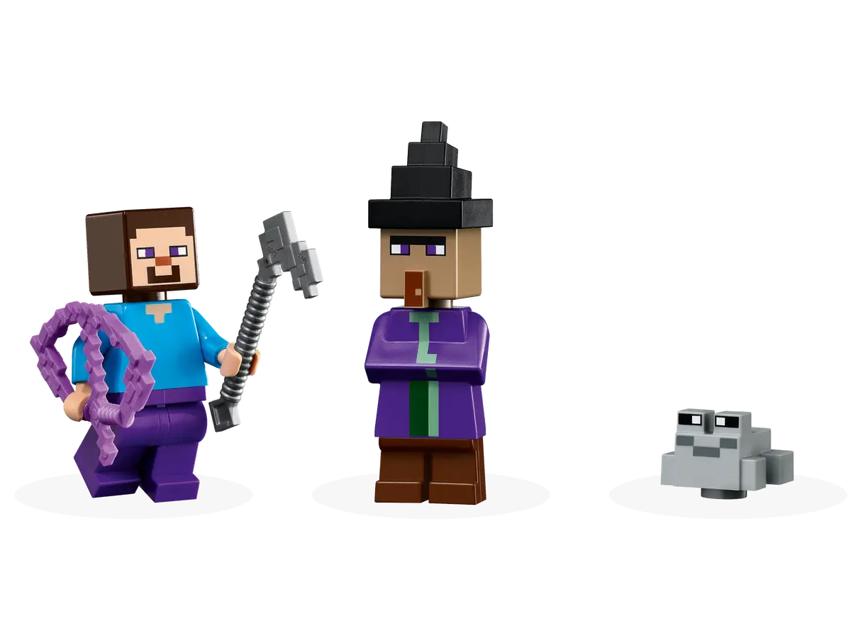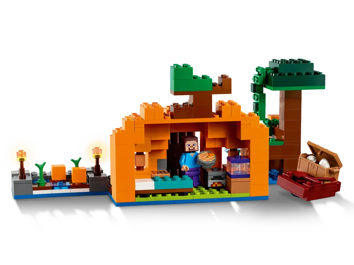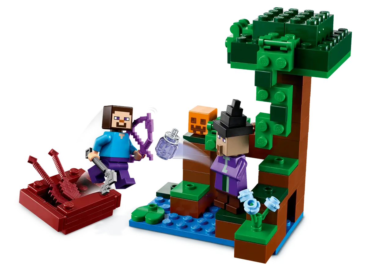 Ta pełna możliwości przebudowywania zabawka przedstawia słynny bagienny biom oraz głównego bohatera Steve’a na dyniowej farmie otaczającej dom w kształcie dyni. Dom ma umeblowane wnętrze, w którym jest łóżko, stół rzemieślniczy, piec i żabią lampę. Na zewnątrz jest grządka dyni, którą Steve uprawia swoją motyką. Zabawa zmienia się w bitwę, gdy czarownica zaczyna rzucać miksturami w Steve'a, a on odpiera jej ataki, strzelając z łuku. Zestaw zawiera również żabę, łódkę i skrzynię z jajkiem i cukrem, dzięki czemu dzieci mogą zrobić ciasto dyniowe! Dodatkową cyfrową zabawę zapewni aplikacja LEGO Builder, gdzie konstruktorzy mogą powiększać i obracać zestawy w 3D oraz śledzić swoje postępy.