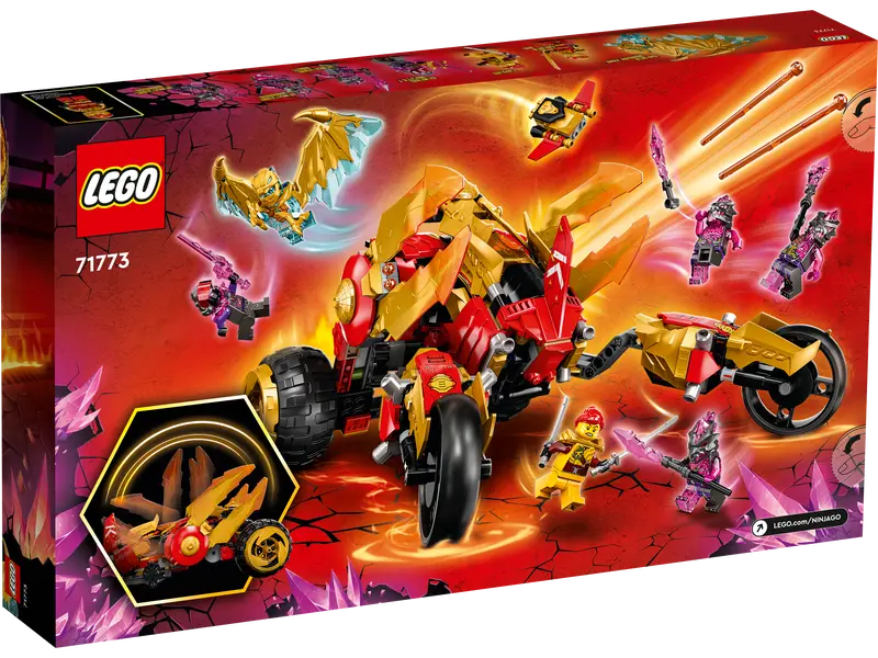 Ośmioletni i starsi fani wojowników ninja mogą odgrywać pełne emocji sceny z serialu NINJAGO®: Crystallized dzięki zestawowi Złoty smoczy ścigacz Kaia (71773). Pociechy znajdą tu pojazd terenowy z kokpitem, dwoma działkami z czterema miotaczami oraz złotymi smoczymi ostrzami. Składając tylne koła ścigacza, można go zmienić w maszynę kroczącą.