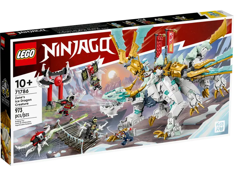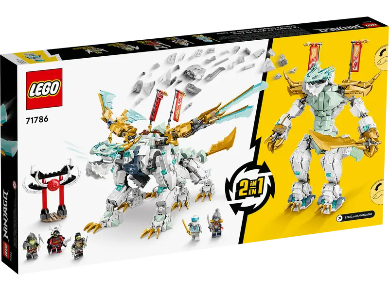 Zestaw LEGO® NINJAGO® Lodowy smok Zane’a (71786) zawiera wszystko, czego potrzebują dzieci w wieku od 10 lat do zabawy w odgrywanie ról z bohaterami ninja. Ten model NINJAGO 2 w 1 umożliwia stworzenie ruchomego lodowego smoka z sześcioma nogami, długim ogonem, rogami i skrzydłami ze złotymi ostrzami, a następnie przebudowanie go w ruchomego smoczego wojownika stojącego na dwóch nogach i trzymającego duże złote ostrze.