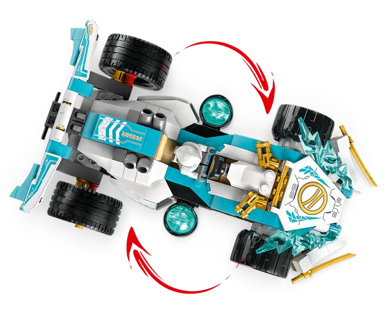 Fani ninja w wieku od siedmiu lat będą zachwyceni odgrywaniem scen z serialu telewizyjnego NINJAGO® Dragons Rising z wykorzystaniem niespotykanej dotąd funkcji obrotu w samochodzie wyścigowym w zestawie Smocza moc Zane’a — wyścigówka spinjitzu (71791). Kiedy dzieci naciskają spojler z tyłu, tylne koła samochodu unoszą się i poruszają na smoczych elementach mocy, dzięki czemu ninja może stawić czoła złym łowcom smoków.
