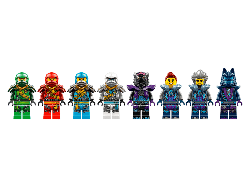 Model do zbudowania zawiera także osiem minifigurek postaci NINJAGO: wspinacza Kaia, wspinacza Lloyda, wspinaczkę Nyę i wspinacza Zane’a (każde z hakiem do wspinaczki i kataną), złoczyńców Lorda Rasa, Jordanę i Cindera z mieczami oraz złego szponiastego wojownika Wilczej Maski.