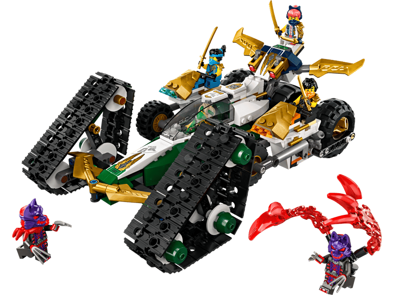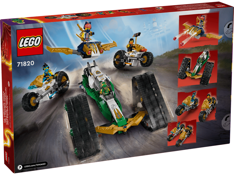 Dzięki zestawowi Wielofunkcyjny pojazd ninja (71820) dziewięciolatki i starsze dzieci mogą odgrywać emocjonujące przygody z drugiego sezonu serialu NINJAGO® Powstanie Smoków. Mają do wyboru jeden duży pojazd NINJAGO lub cztery mniejsze pojazdy: szybowiec Sory z dwoma miotaczami klocków, samochód terenowy Lloyda oraz motocykle Cole’a i Nyi.