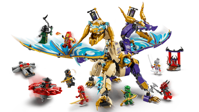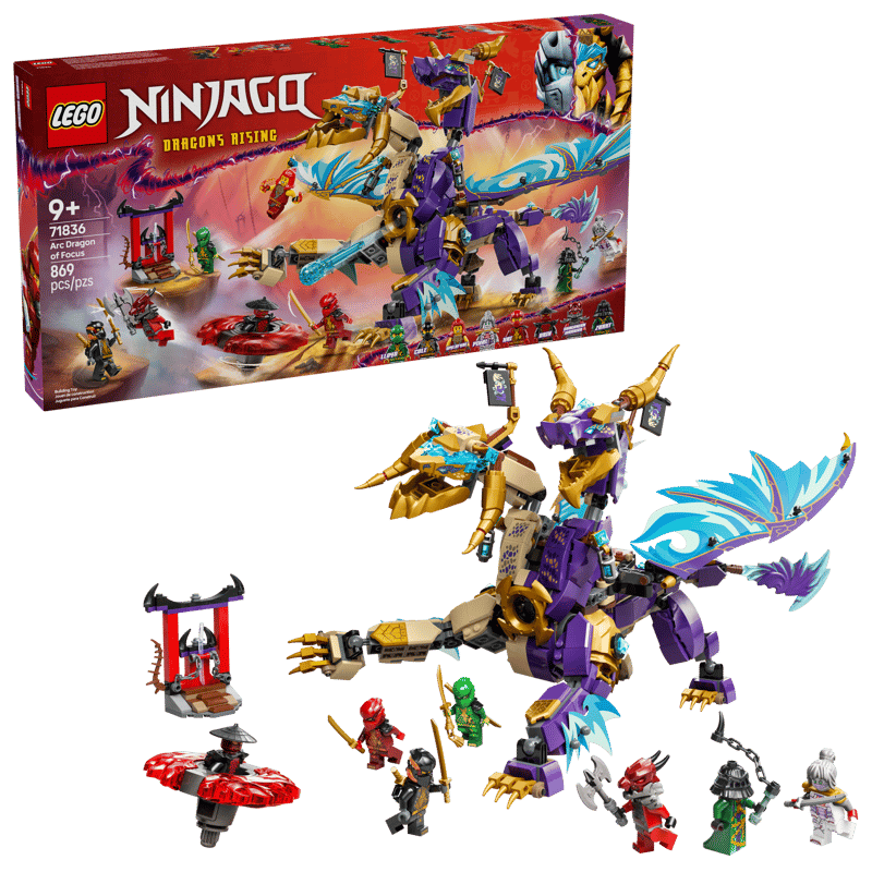 Zaskocz dziewięciolatków i starsze dzieci zestawem ninja LEGO® NINJAGO® Arcysmok skupienia (71836), dzięki któremu odegrają epickie sceny akcji z trzeciego sezonu serialu NINJAGO Powstanie Smoków. Ten zestaw konstrukcyjny zawiera figurkę smoka z dwoma głowami, ruchomym ogonem, nogami, stopami, głową, szyją, szczęką i szponami. Dzieci mogą aktywować miotacz klocków na tułowiu i poruszać jego dużymi foliowymi skrzydłami za pomocą dźwigni na jego plecach. Ten zestaw bitewny zawiera osiem minifigurek postaci NINJAGO do odgrywania pełnych akcji przygód. Ponadto obejmuje wojowników ninja Lloyda, Cole’a, Wyldfyre i Kaia oraz ich pomocniczkę Pixal, z których każde ma broń, a także złoczyńców: Drixa, Zarkta i dragońskiego wojownika z broniami. Zabawę urozmaica fajny pojazd spinner Spinjitzu. Dzieci mogą umieścić w nim minifigurkę i nacisnąć przycisk na wyrzutni, która ją wystrzeliwuje. Następnie mogą obserwować, jak dwa żywioły mocy odlatują, gdy pojazd uderza w cel.