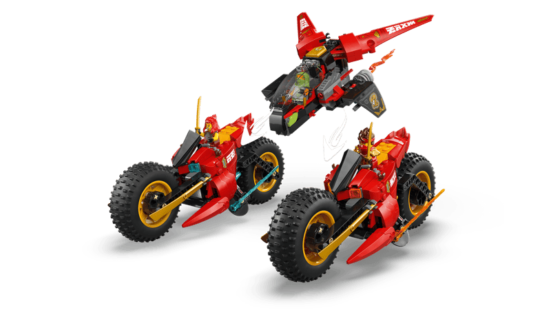 Dzięki zestawowi 3 w 1 LEGO® NINJAGO® Pojazd bojowy ninja (71844) dzieci w wieku od ośmiu lat mogą odgrywać sceny z trzeciego sezonu serialu NINJAGO®: Powstanie Smoków. Duży motocykl ninja można rozdzielić na trzy mniejsze pojazdy: motocykl Kaia, motocykl Wyldfyre i odrzutowiec Fraka z dwoma miotaczami klocków.