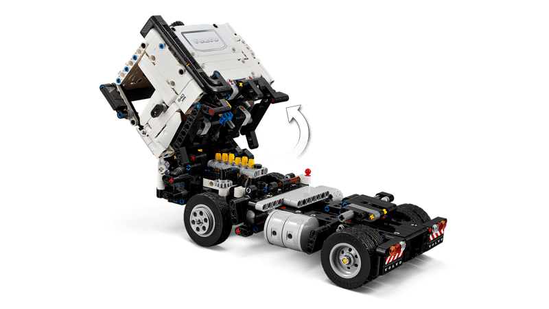 Młodzi konstruktorzy mogą otworzyć drzwi ciężarówki LEGO Technic i odchylić kabinę operatora, aby zobaczyć sześciocylindrowy silnik z ruchomymi tłokami. Następnie mogą ustawić ciężarówkę w odpowiednim miejscu, odłączyć przyczepę i rozłożyć najazd, aby zjechać koparką.