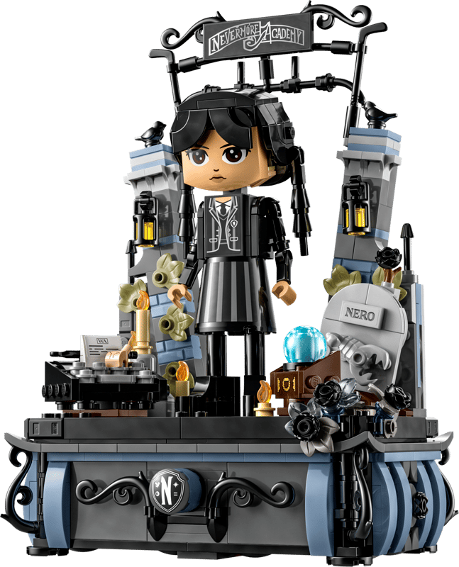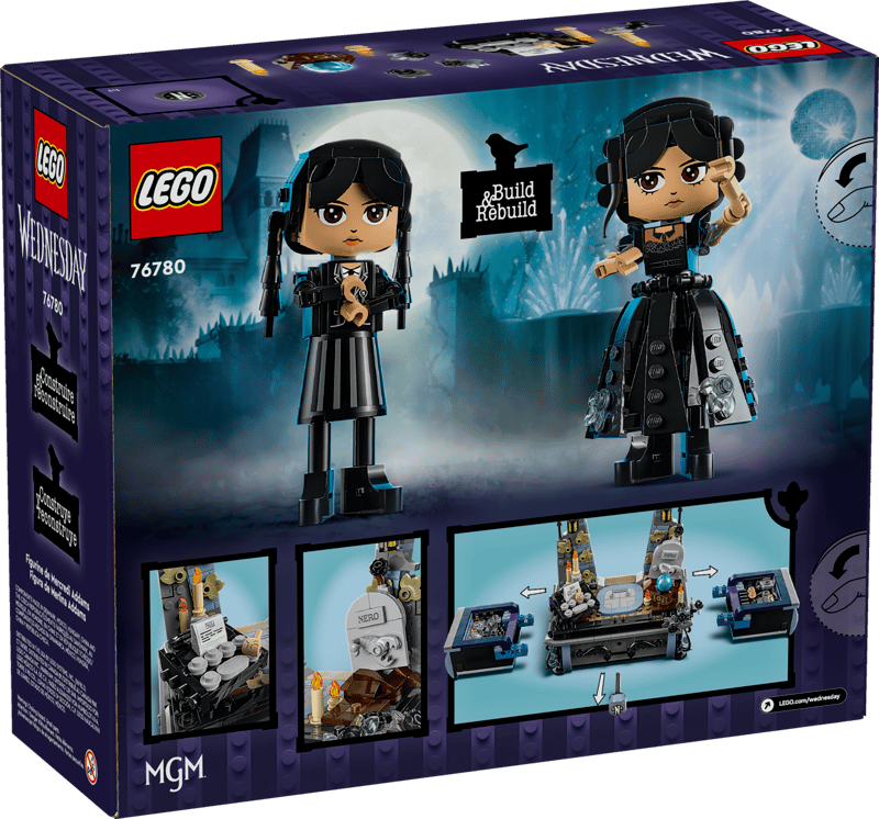 Na dziesięciolatków i starsze dzieci czekają tajemnice i chaos w zestawie Figurka Wednesday Addams (76780). Ten zestaw z serii LEGO® Wednesday zawiera kolekcjonerski model z ruchomą głową, ramionami i stopami, a także dwie twarze i dwie stylizacje, dzięki którym figurkę można przebudowywać. Ponadto obejmuje lojalnego pomocnika Rączkę, podstawkę z czarnymi daliami i dwa schowki na skarby, takie jak sukienka ze szkolnego balu lub mundurek. Całości dopełnia brama Akademii Nevermore i akcesoria, takie jak maszyna do pisania Wednesday, grób Nero, szklana kula i inne.