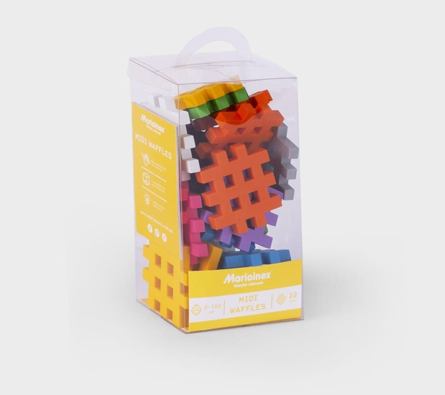 Klocki Midi Waffle są nieco większą odmianą klocków Mini Waffle (5,7 cm x 5,7 cm). Tak jak one mają wyjątkowy kształt, który pozwala im łączyć się na różne sposoby. 10 wypustek oraz 4 otwory sprawiają, że elementy da się składać w płaskie, a także przestrzenne konstrukcje. Są wykonane z wytrzymałego, nietoksycznego oraz w pełni biodegradowalnego tworzywa sztucznego. W dotyku przypominają gumę, są elastyczne oraz mają gładkie brzegi.