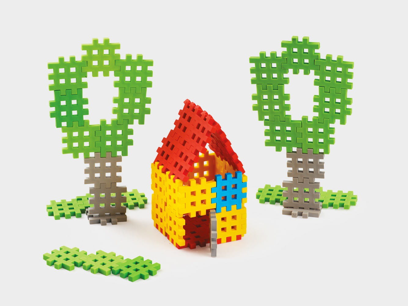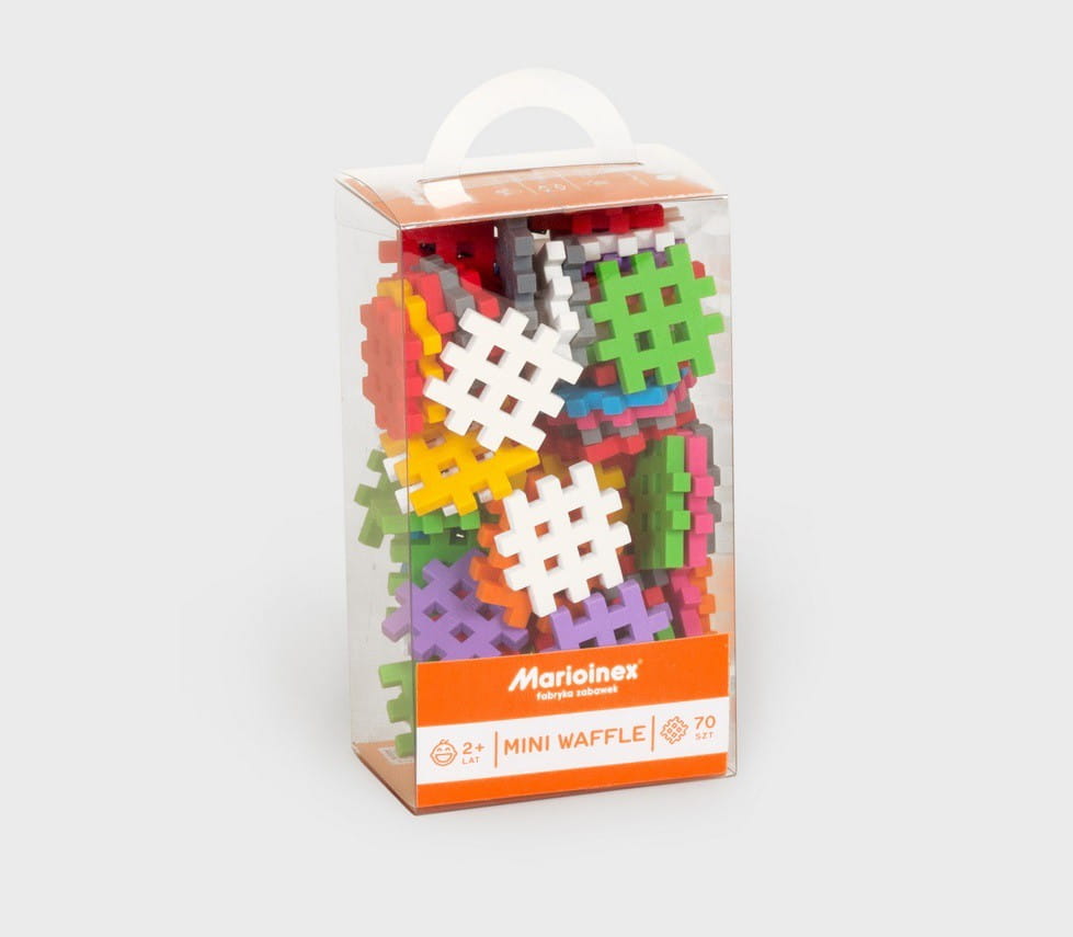 Klocki Mini Waffle to flagowy kształt gofra, albo wafla wykonane z elastycznego tworzywa sztucznego. Posiadają po 10 wypustek i 4 otwory. Dzięki temu można swobodnie łączyć je jak puzzle, tworząc rozmaite konstrukcje 2D oraz 3D. Stosowany do ich produkcji materiał jest w pełni odnawialny w procesie recyklingu i całkowicie bezpieczny dla dzieci. W dotyku przypomina nieco gumę, ponieważ jest elastyczny.