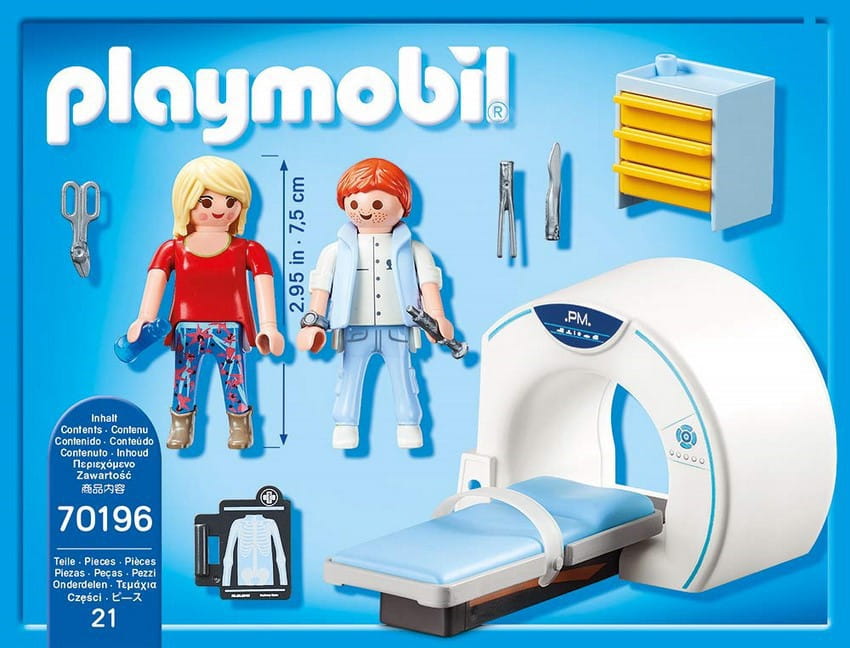 Radiolog używa maszyny MRI do badania narządów wewnętrznych pacjenta. Pacjent kładzie się na kanapie i zostaje wbity w rurkę. To może być przerażające, więc mocno trzyma przycisk awaryjny w dłoni. Ale wszystko działa płynnie i idzie szybciej niż oczekiwano. Już została wypędzona na zewnątrz i lekarz przychodzi, aby omówić wynik śledztwa. Na szczęście na zdjęciach nie ma nic niepokojącego Zestaw do zabawy zawiera dwie figurki PLAYMOBIL, urządzenie MRI z leżakiem i paskami do trzymania oraz inne dodatki. Kanapę można przesunąć o 4 cm do jednostki MRI.