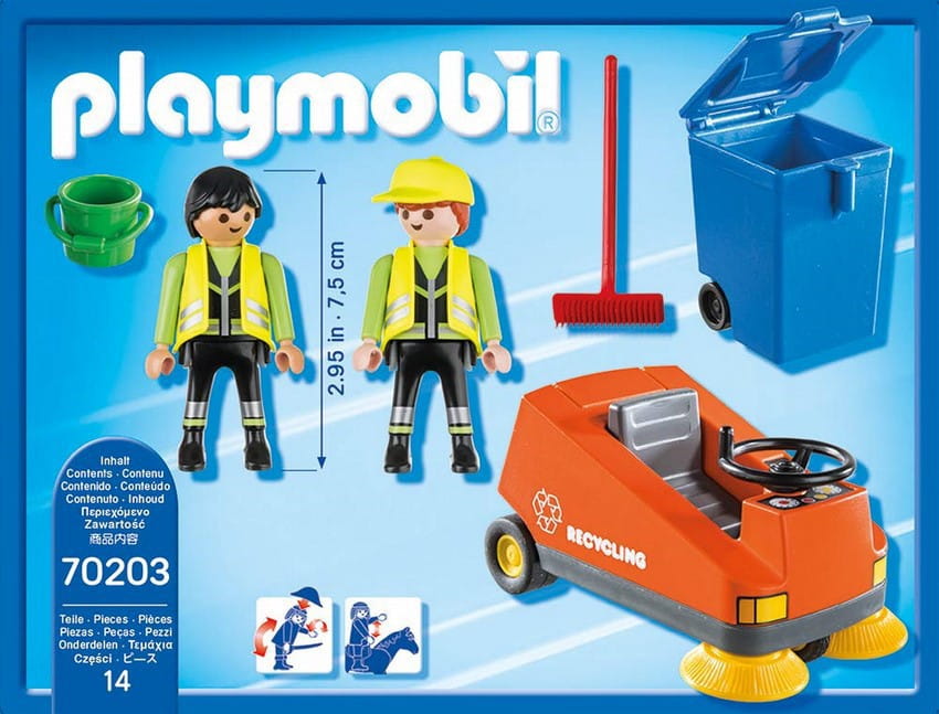 Porządek musi być! Zajęty sprzątaniem ulic PLAYMOBIL® za pomocą zamiatarki zapewnia czystość na drodze. Powoli kierowca prowadzi zamiatarkę po drodze, aby wszystko było czyste. Dzisiaj praca jest łatwa, ponieważ krótko przedtem byli tam koledzy ze śmieci i już je wywieźli. Zawsze może być tak łatwo.
