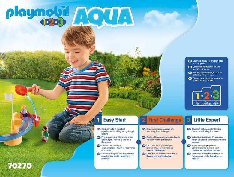 Małymi krokami w wielki świat PLAYMOBIL. Kolorowe zestawy do zabawy PLAYMOBIL-1.2.3 Aqua z różnymi etapami rozwoju, zachęcają maluchy do zabawy Zjeżdżalnia wodna może być również połączona z kołem wodnym z karuzelą (70268).