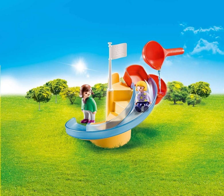 Lato, słońce i zabawa w wodzie - idealne trio. Zjeżdżalnia wodna PLAYMOBIL-1.2.3 daje jeszcze więcej radości. Najpierw idziemy na górę, potem wlewamy wodę do pojemnika obok siedzenia. Jeśli w zbiorniku jest wystarczająco dużo wody, fotel przechyla się i możesz się ślizgać!