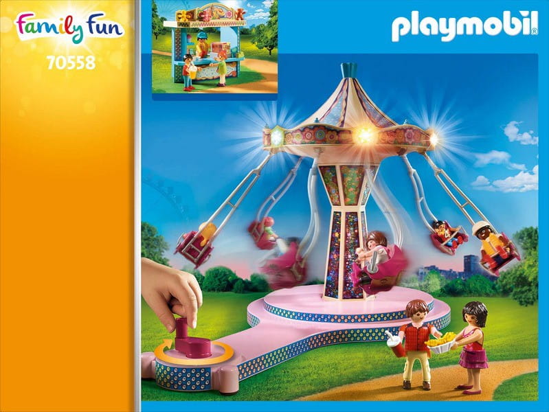 Hurra - idziemy do dużego parku rozrywki! Dzieci nie mogą się doczekać największej atrakcji - karuzeli łańcuchowej i z uśmiechem siadają na krzesełkach. Mama wraz z bliźniakami czeka niedaleko, a tata kupuje słodycze na stoisku. W następnej kolejności pora na zabawę na huśtawce w kształcie łódki. Zestaw zawiera sześć figurek dorosłych, pięć figurek dzieci, karuzelę łańcuchową z kolorowym oświetleniem, huśtawkę w kształcie łódki oraz stoisko z lodami, napojami i zabawkami. Karuzela łańcuchowa może być ręcznie napędzana korbą. Baterie nie są zawarte w zestawie.