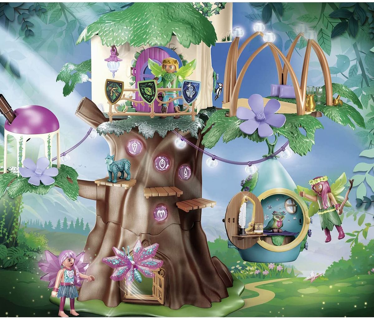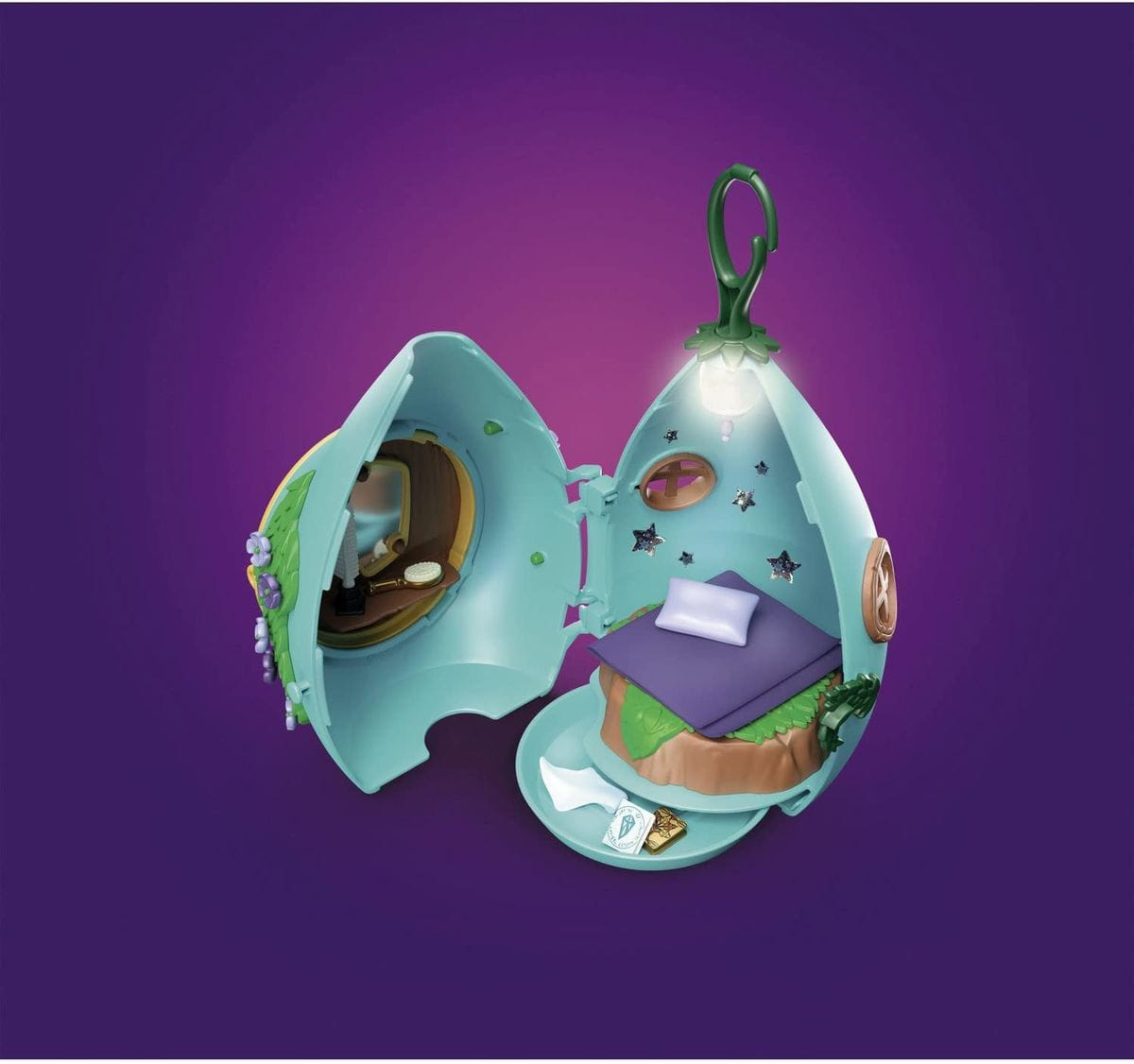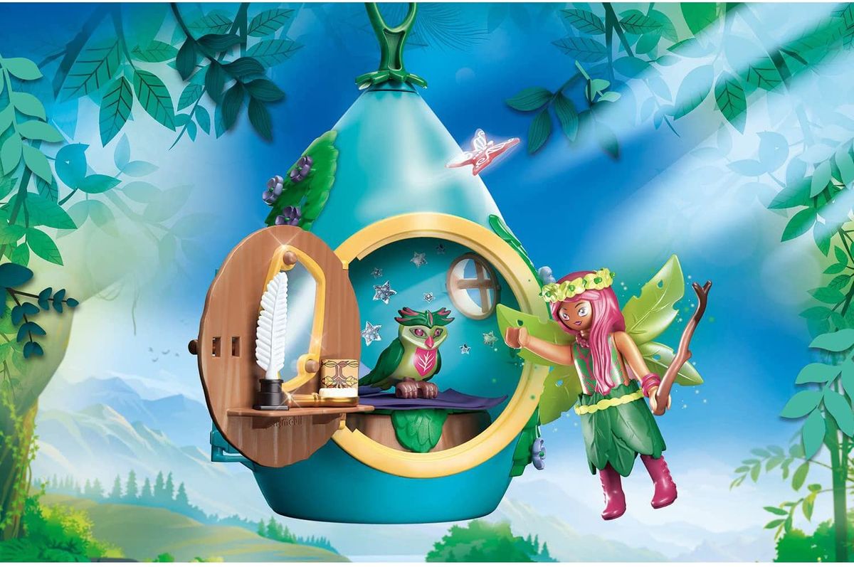 Przytulnie urządzony domek zapewnia schronienie dla jednej wróżki. Za pomocą haczyka można go powiesić na drzewie wróżek lub w pokoju dziecięcym. Domek można ozdobić błyszczącymi naklejkami w kształcie gwiazdek. W zestawie znajduje się tajemnicza skrytka! Zestaw można połączyć z zestawem Playmobil 70799 Drzewo wróżek (sprzedawany oddzielnie).