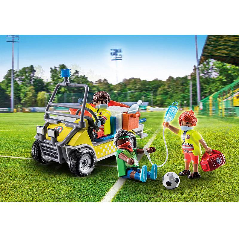 Playmobil 71204 Samochód ratunkowy. Wskocz do wózka ratunkowego i ruszaj na miejsce! Zwrotny wózek może błyskawicznie dotrzeć na miejsce wypadku, nawet w trudnym terenie. Tym razem na boisku do piłki nożnej doszło do sytuacji awaryjnej. Ekipa ratunkowa szybko podchodzi do poszkodowanego. Piłkarz został poważnie sfaulowany i nie można wykluczyć kontuzji szyi, więc najpierw zakłada się mu ortezę, aby go ustabilizować. Następnie ratownicy medyczni ostrożnie podnoszą zawodnika na nosze transportowe, a następnie na caddie. Szybko trafia do szpitala na dalsze dokładne badania. Zestaw zabawek zawiera 3 figurki PLAYMOBIL, wózek ratunkowy, nosze transportowe, opatrunek, zestaw infuzyjny i wiele innych dodatków do ekscytujących misji ratunkowych w pokoju dziecięcym. Pacjenci mogą być transportowani leżąc na noszach ratunkowych na caddie. Z dołączonymi etykietami gipsowymi, rany goją się w mgnieniu oka. Seria PLAYMOBIL City Life obejmuje nowoczesne pojazdy i realistyczne modele, dzięki którym dzieci mogą zanurzyć się w ekscytującej zabawie w odgrywanie ról.