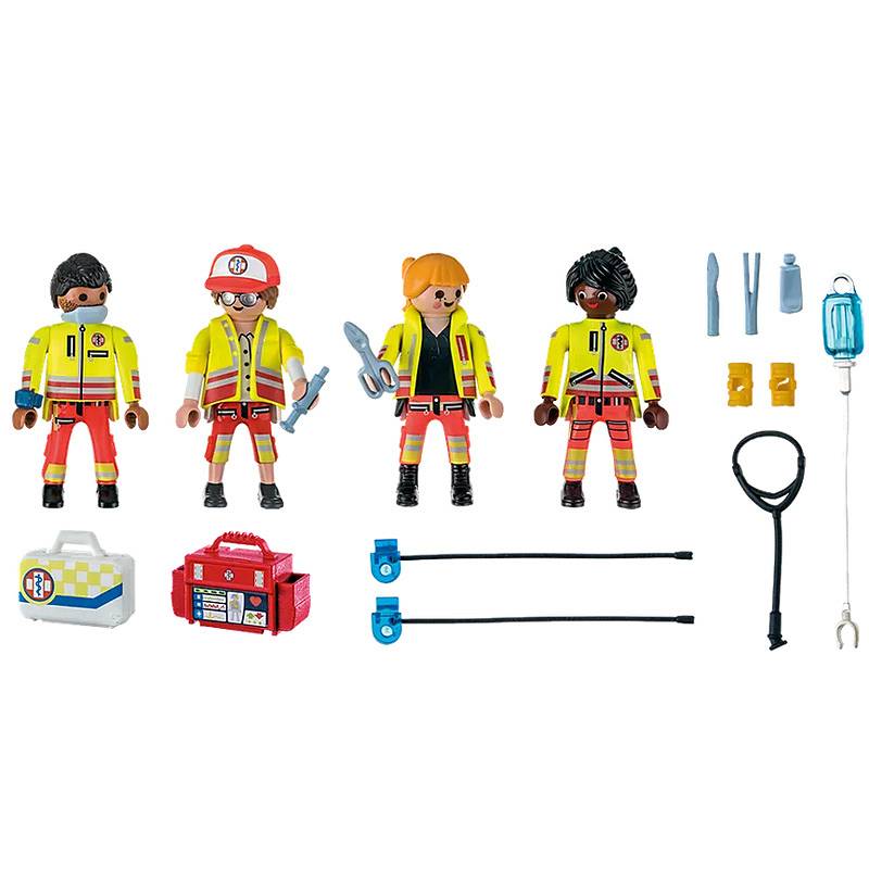 Playmobil 71244 Zespół ratunkowy. Dołącz do Zespołu Medycznego PLAYMOBIL i zostań bohaterem dnia codziennego. Czteroosobowy zespół jest nie tylko doskonale wyszkolony, ale także doskonale wyposażony na wszelkie sytuacje awaryjne. W przypadku zawału serca ratownicy medyczni mają ze sobą swoją nowoczesną torbę na defibrylator. Dzięki defibrylatorowi pacjentom można szybko pomóc. Torba na defibrylator i torba lekarska zapewniają miejsce na inne akcesoria medyczne, takie jak nożyczki, pęsety i opatrunki szynowe. Silikonowe bandaże szynowe dopasowują się elastycznie. Chwyć stetoskop i przygotuj się do akcji! Szczegółowy zestaw figurek dla dzieci w wieku od 4 lat zawiera cztery figurki PLAYMOBIL, butelkę infuzyjną z rurką, narzędzia pierwszej pomocy, bandaże, walizkę lekarską i inne akcesoria do ekscytujących misji ratunkowych w pokoju dziecięcym. Z figurek można zdjąć nakrycie głowy, maskę i zegarek. Seria PLAYMOBIL City Life obejmuje nowoczesne pojazdy i realistyczne modele, dzięki którym dzieci mogą rozwijać ważne umiejętności i pewność siebie.
