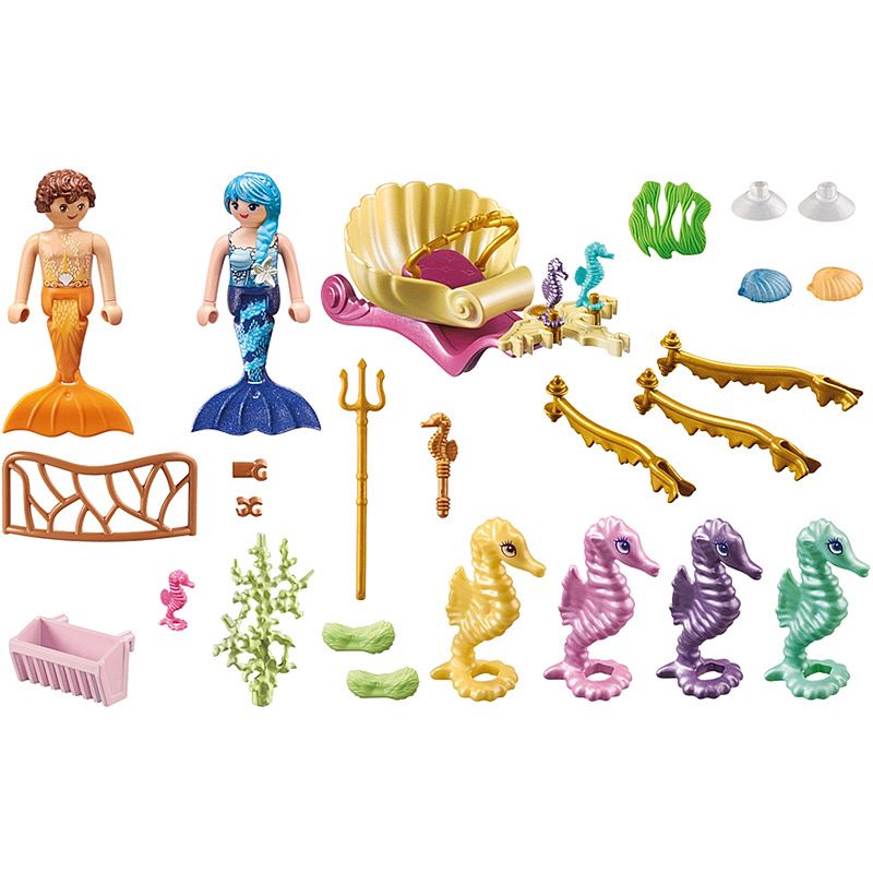 Zanurz się i rozpocznij zabawę ze wspaniałym zestawem PLAYMOBIL Podwodni mieszkańcy z powozem koników morskich. Syrenki wraz z konikami morskimi odkrywają głębiny oceanu przemierzając jego bezkres w połyskującym podwodnym powozie. Ciekawe, co uda im się dzisiaj odkryć? Seria PLAYMOBIL Princess Magic Syrenki zaprasza do magicznego podwodnego świata. Pięknie zaprojektowane figurki i zwierzęta zachęcają dzieci w wieku od 4 lat do przeżywania coraz to nowych przygód. Zestaw zawiera dwie figurki PLAYMOBIL, cztery duże koniki morskie, podwodny powóz i wiele innych akcesoriów. Dzięki przyssawkom muszelki można przymocować do gładkich powierzchni.