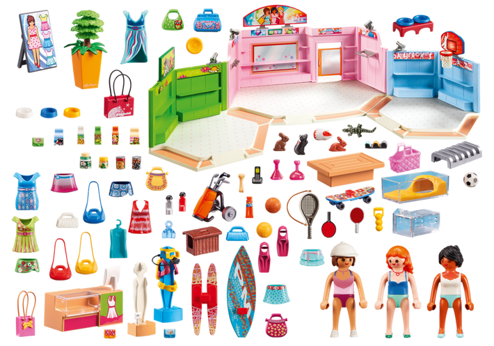 W zestawie znajduje się wiele elementów w tym: 3 figurki, ścianka butiku, ścianka sklepu zoologicznego i sportowego, ubrania, akcesoria sportowe, akcesoria dla zwierząt i wiele innych akcesoriów.