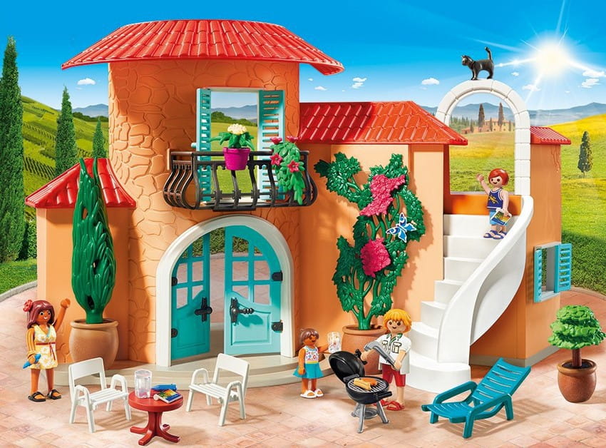 Słoneczna wakacyjna willa to fantastyczny, kompleksowy zestaw nawiązujący do letniego czasu, pięknej roślinności i grillowania w ogrodzie. Domek z dwuskrzydłowymi, otwieranymi drzwiami, oknami z okiennicami, balkonem i schodami. Na parterze znajduje się kuchnia z jadalnią (zamontowany piec i zlewozmywak), oraz łazienka z wanną i umywalką. Na piętro prowadzą lekko zakręcone schody, znajdują się tu dwie sypialnie. Całość uzupełniają tematyczne akcesoria wyposażenia domku.