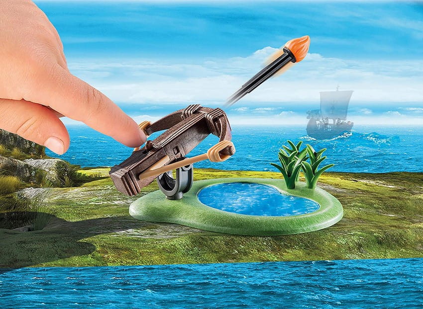 W skład zestawu wchodzi wiele elementów w tym: smok Hokokieł, figurka Sączysmarka, siodło, owca, ryby, balista i wiele innych akcesoriów.