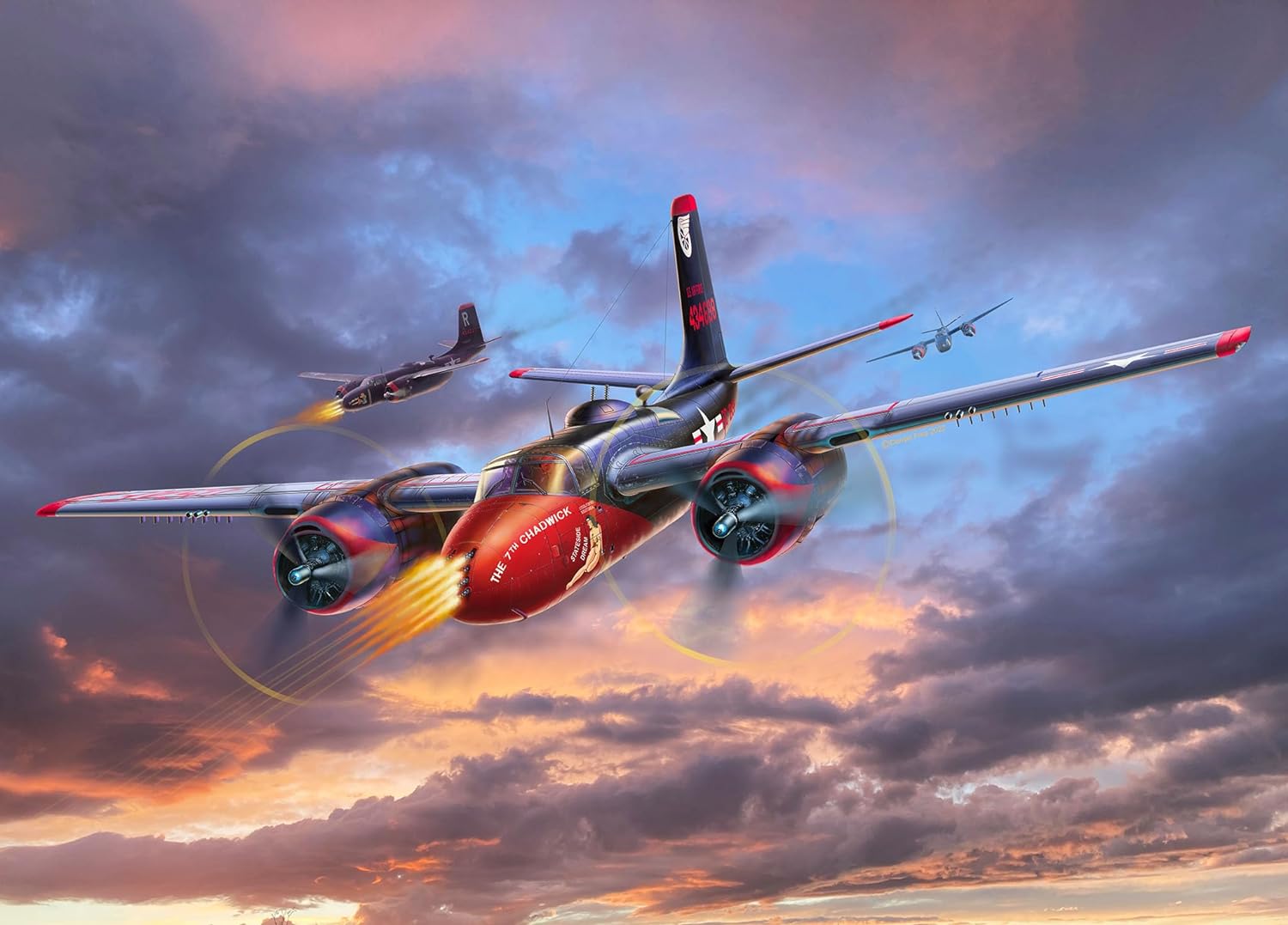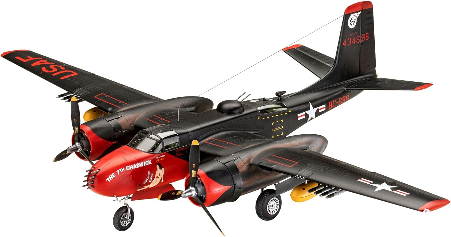 Zestaw modelarski do budowy dwusilnikowego bombowca „B-26-C Invader”. „B” to skrót od „Bomber”. B-26C Invader został zbudowany przez Douglas Aircraft Company, a swój dziewiczy lot odbył 10 lipca 1942 r. • Szczegółowa struktura powierzchni • Imitacja kokpitu • Szczegółowe nadkola • Szczegółowe podwozie. Autentyczne odwzorowanie następujących wersji: – B-26B-56, 44-34698, „The 7th Chadwick”, 3rd BG/13th BS, Korea 1952 – B-26B-56, 44-34405, „The 5th Chadwick”, 3rd BG/13th BS, Japonia 1951