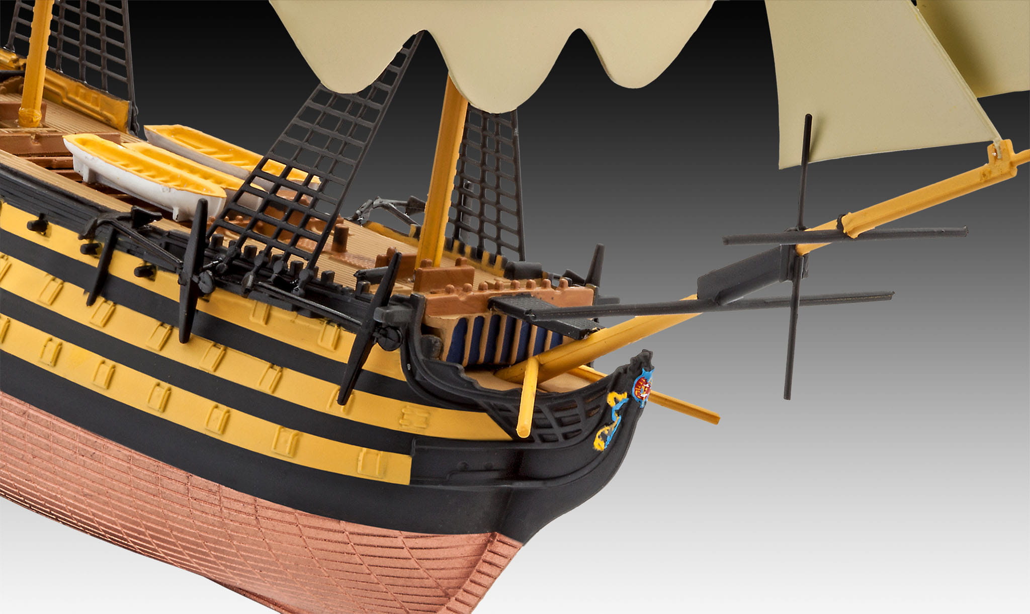 Łatwy w budowie model Maszty jednoczęściowe Żagle Szczegółowy kadłub Teksturowany pokład Artyleria Łodzie ratunkowe Kalkomania Zestaw do samodzielnego montażu.