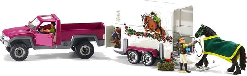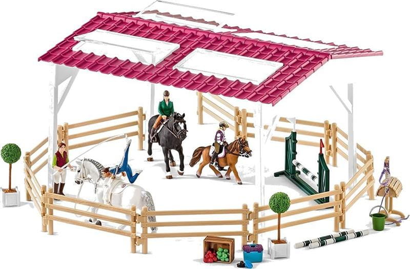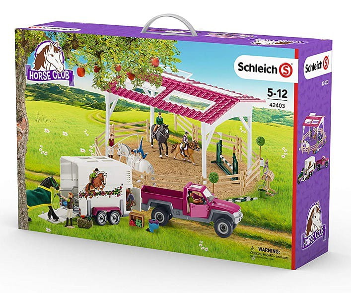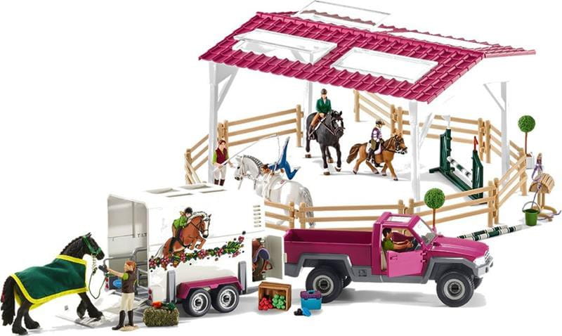 Szkoła jeździectwa 42403 to bogato wyposażony zestaw dla miłośników jazdy konnej. Kolekcjonerzy znajdą tu samochód typu pickup i przyczepę, w której można transportować dwa konie. Zadaszenie z otwieranymi oknami można wykorzystać do treningów w deszczowe dni lub parkować tam samochód. Całe mnóstwo akcesoriów do jazdy konnej i opieki nad zwierzętami wzbogaca zabawę i budowanie scenerii.
