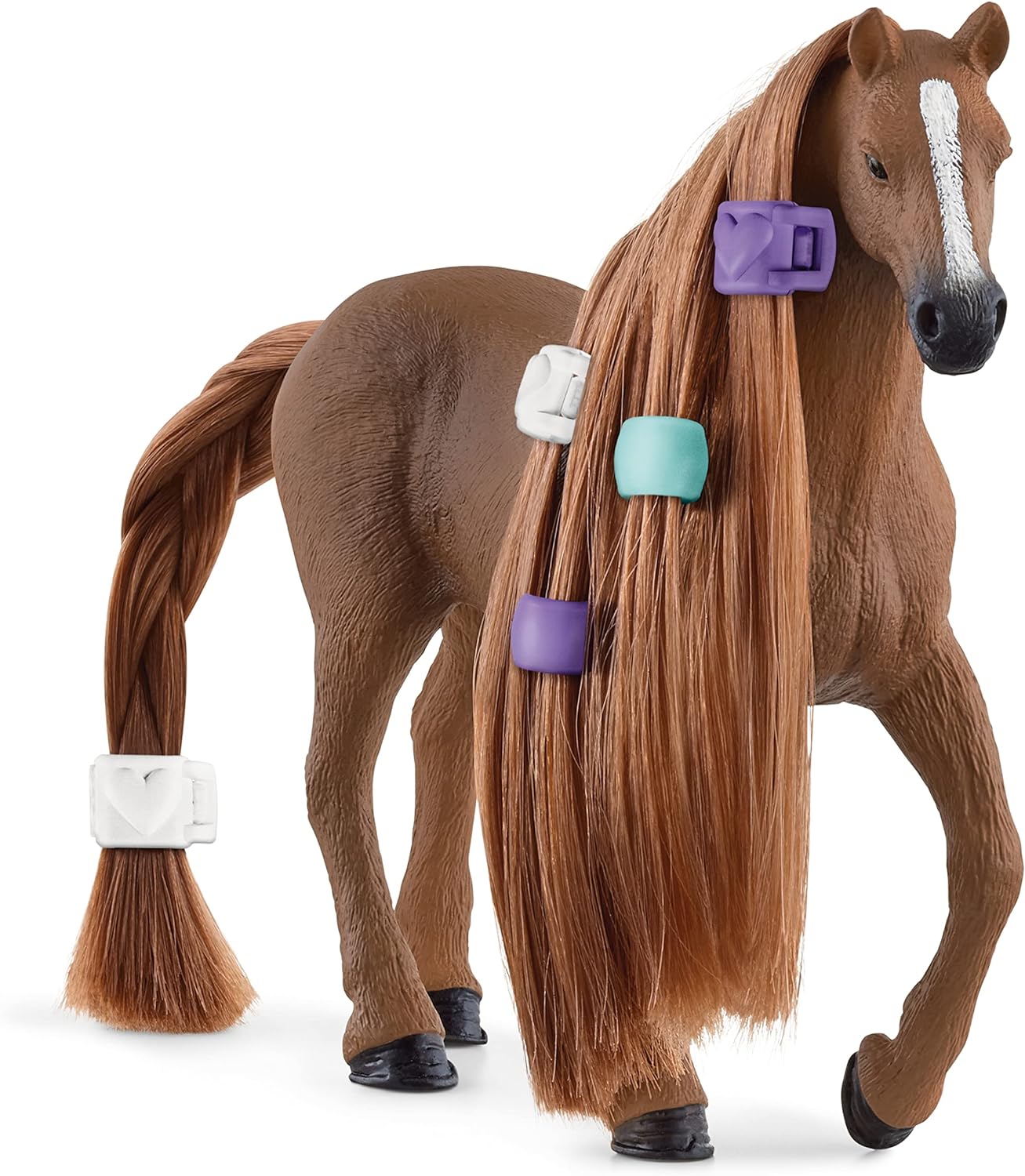 Piękna klacz pełnej krwi angielskiej z włosami do stylizacji jest najwyższej jakości autentycznie wykonaną figurką, której grzywę i ogon możesz czesać, układać i upiększać. Dzięki dołączonym akcesoriom będziesz miała okazję spersonalizować wygląd swojej klaczy.