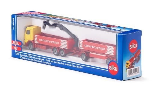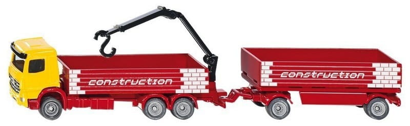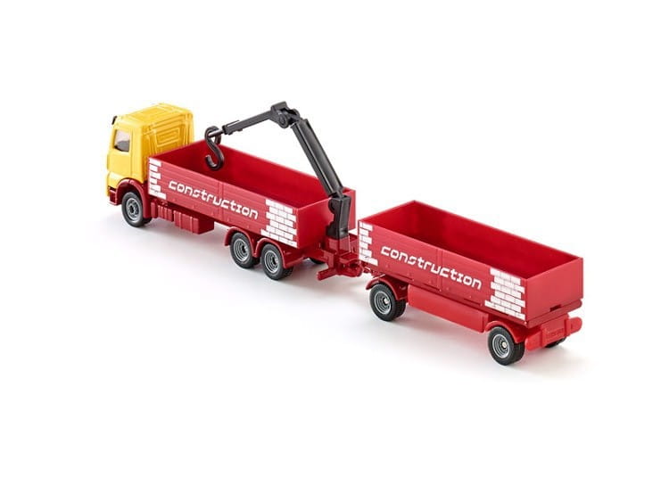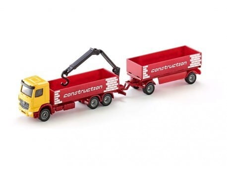 Mercedes-Benz Arocs z kabiną kierowcy na długim trójosiowym podwoziu ze skrzynią ładunkową i dźwigiem oraz dwuosiową przyczepą ze skrzynią ładunkową. Ten typowy pojazd dostawczy nadaje się na każdy plac budowy, a teraz dostarczy niezbędne materiały nawet w trudno dostępne miejsce! Skala: 1:87