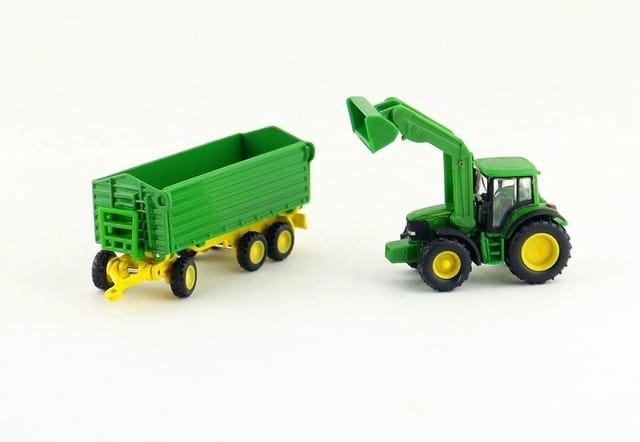 Model traktora marki John Deere wykonany w skali 1:87 z zachowaniem szczegółów pojazdu rzeczywistego. Wyposażony w ruchomą ładowarkę przystosowaną do podnoszenia drobnych przedmiotów, zdejmowaną kabinę i ruchomą przyczepę umożliwiającą transport i wyładunek. Obrotowe koła i gumowe opony umożliwiają poruszanie się po różnych powierzchniach. Model jest atrakcyjną zabawką dla najmłodszych i elementem ciekawych kolekcji.