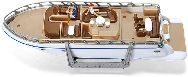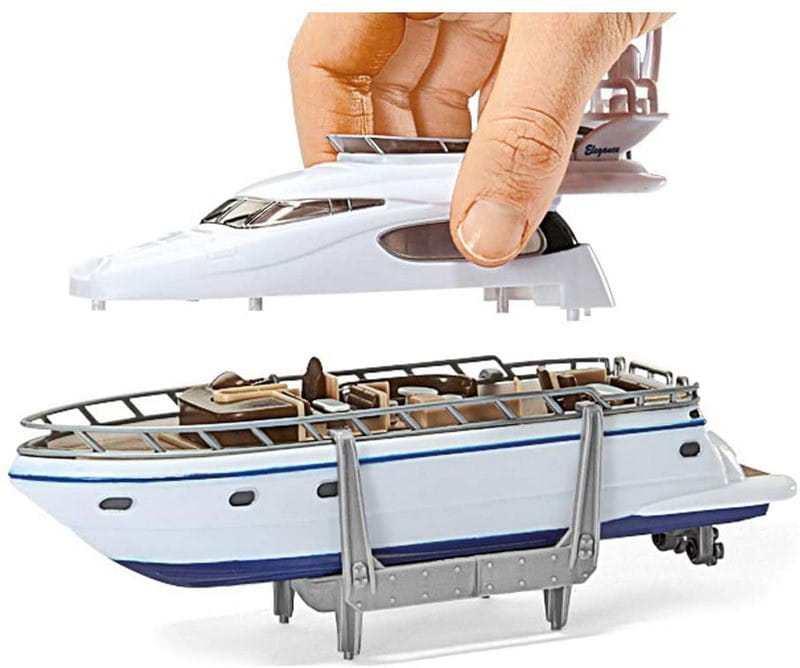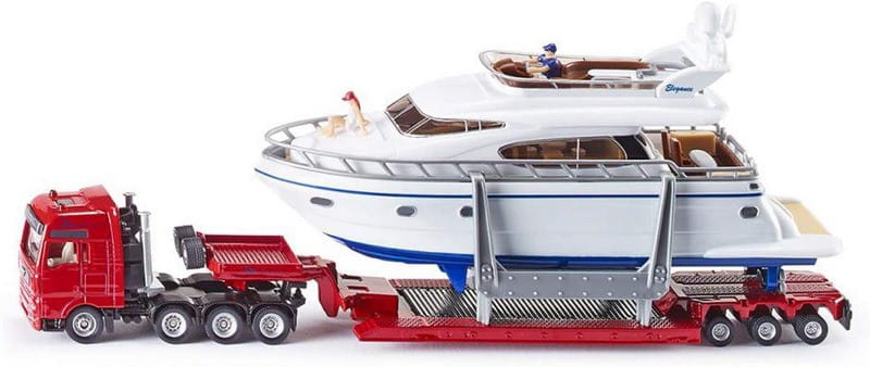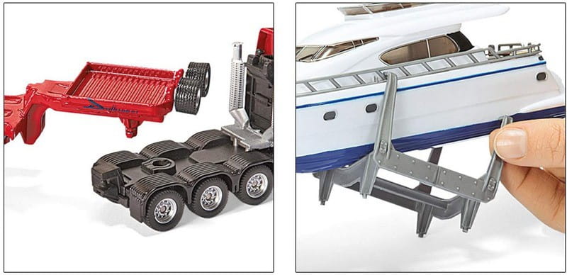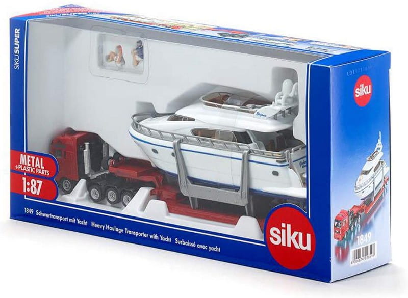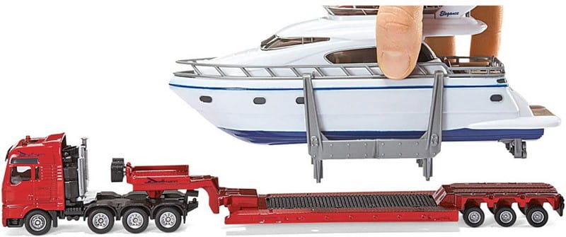 Model ciężarówki z lawetą do przewozu jachtu marki SIKU wykonany w przyjaznej dzieciom skali 1:87 to ciekawa propozycja dla miłośników wodnej przygody. Modele zachowują szczegóły pojazdów rzeczywistych, dzięki czemu zabawa będzie jeszcze bardziej fascynująca. Specjalny stabilizator boczny i gumowe, ciche koła zapewniają bezpieczny transport ekskluzywnego jachtu, wykonanego głównie z metalowych elementów. Ciężarówka bez problemu przetransportuje każde auto w skali 1:87.