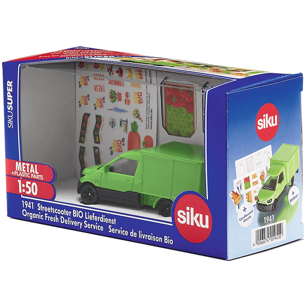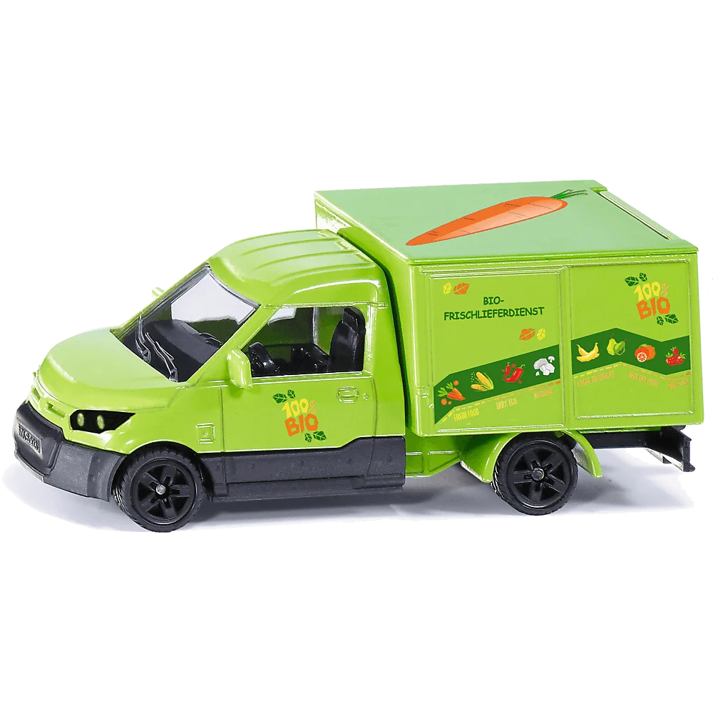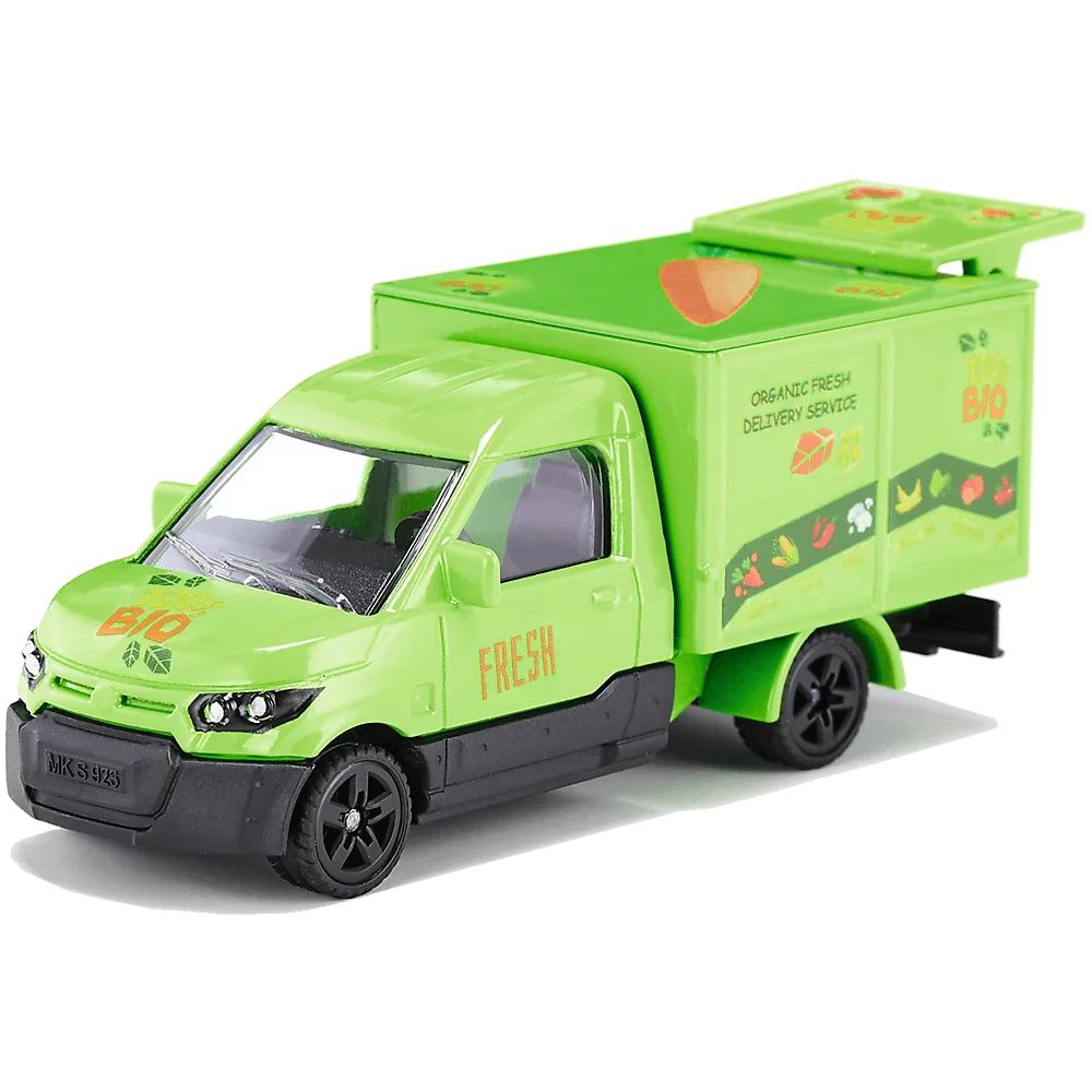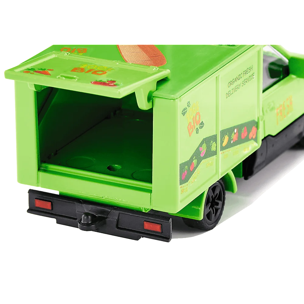Dostawa BIO jedzenia jest całkowicie bezemisyjna dzięki elektrycznemu pojazdowi dostawczemu. Kabina kierowcy tego modelu Siku wykonana jest z metalu, a nadwozie z tworzywa sztucznego. Klapa z tyłu jest otwierana, aby można było załadować i rozładować towar. Pojazd można również ozdobić dołączonymi naklejkami z napisem „Fresh organic deliveries” w różnych językach oraz kolorowymi obrazkami owoców i warzyw. Dostawa wymaga odpowiednich towarów, więc do zestawu dołączone są cztery kartonowe arkusze z produktami spożywczymi, którymi są: owoce, warzywa, jajka oraz mleko. Dwa z nich posiadają tylko kontury, by dziecko mogło wykazać się kreatywnością i samo pokolorować elementy według uznania.