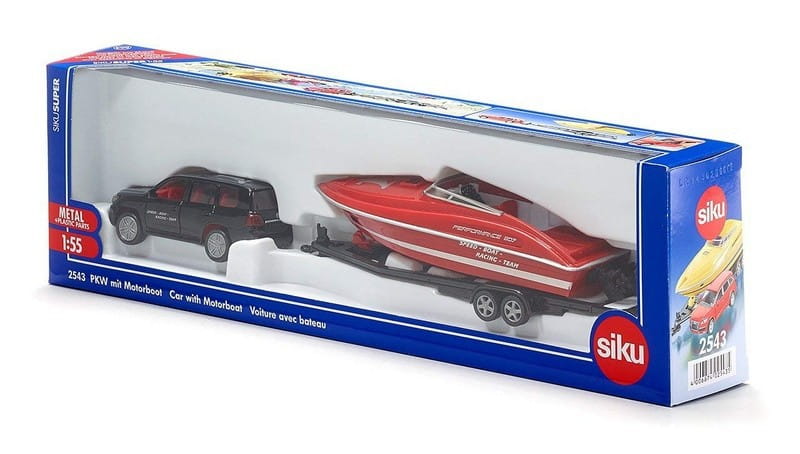Samochód osobowy z lawetą i motorówką został stworzony przez szybko rozwijającą się firmę SIKU, która specjalizuje się w projektowaniu wysokiej jakości zabawek motoryzacyjnych wykonanych z metalu.