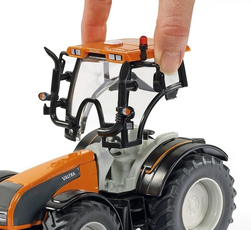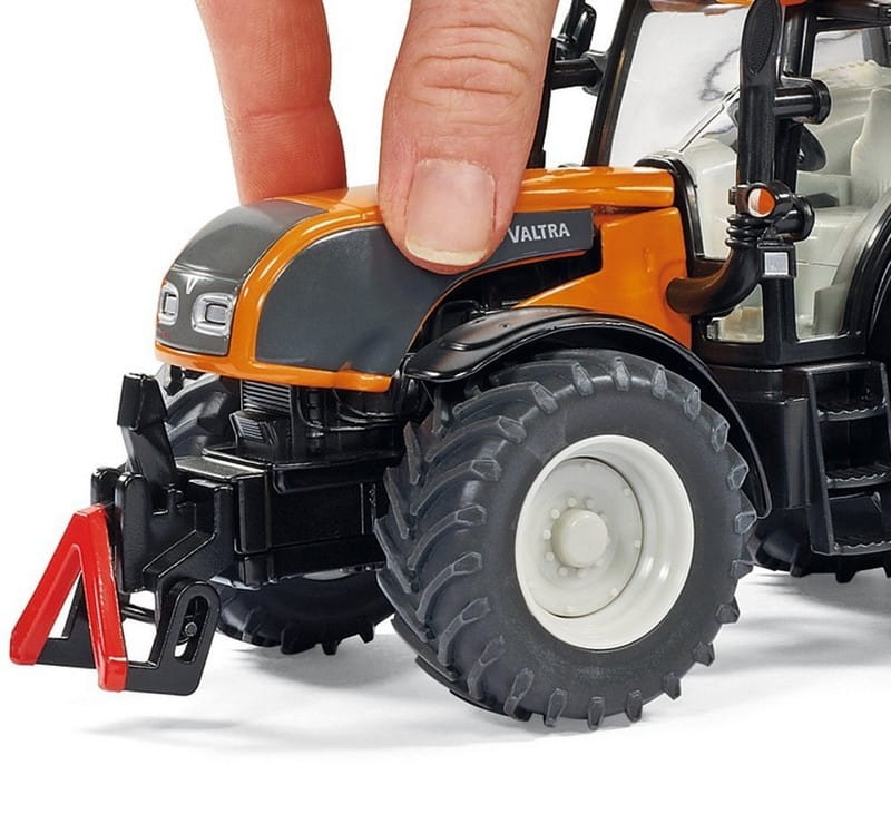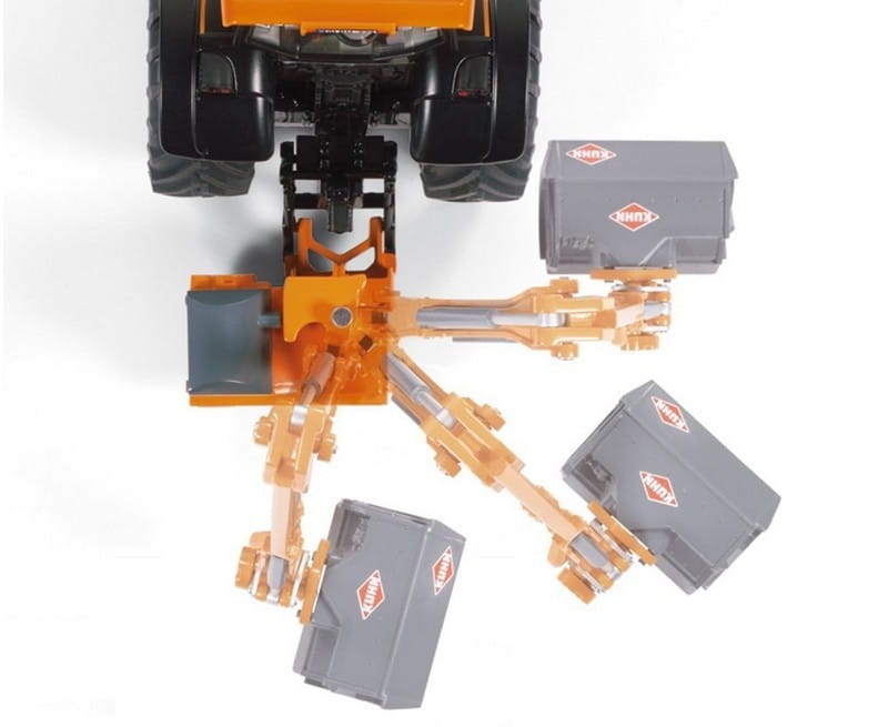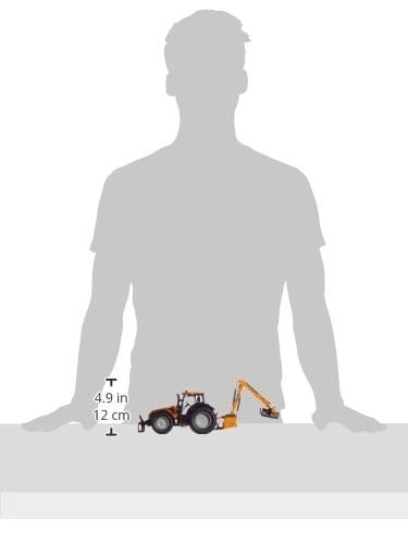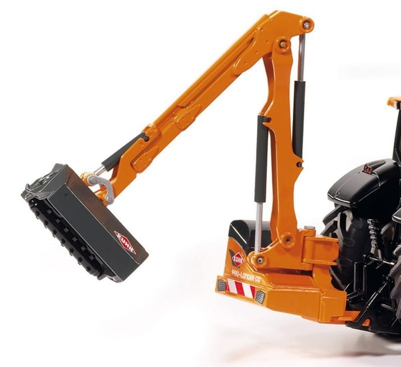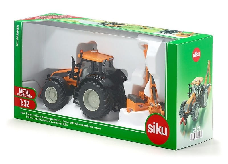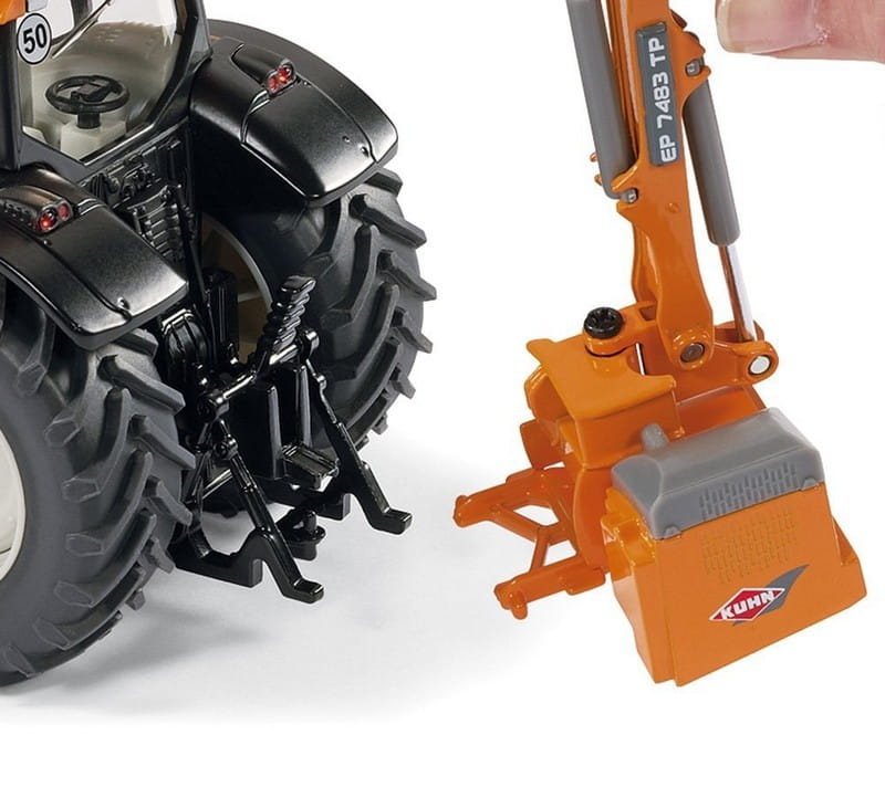 Traktor model Valtra T191 w kolorze pomarańczowym w połączeniu z kosiarką na wyciągu Kuhn ProLonger. Model bardzo starannie wykonany z zachowaniem szczegóły rzeczywistego pojazdu.