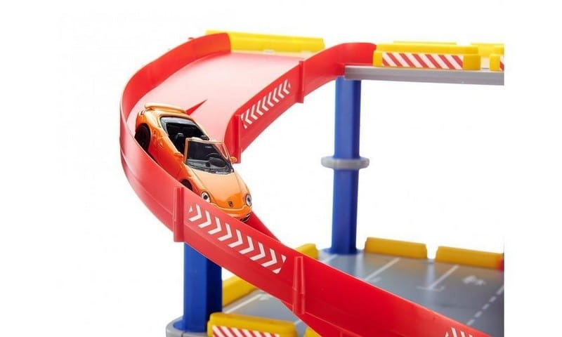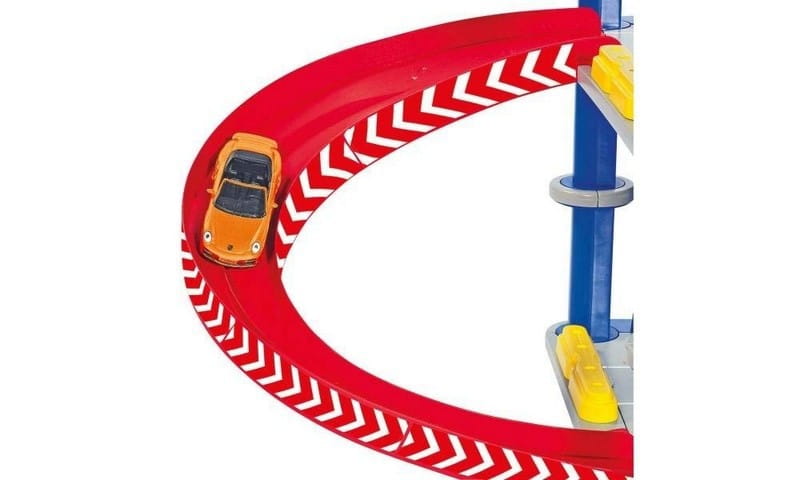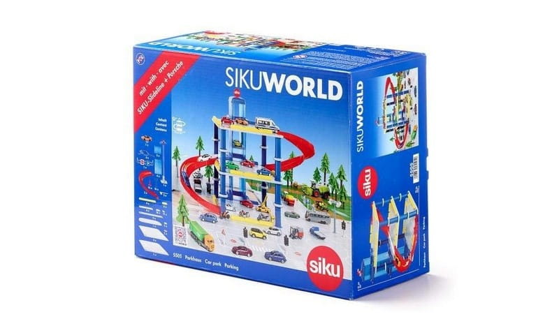 3-poziomowy parking rozciąga się wysoko ponad SIKUWORLD i tym samym wnosi kolorowy i typowo dziecięcy akcent do świata zabaw firmy SIKU oraz do pokoju dziecięcego. Można się nim bawić jako parkingiem wielopoziomowym wolno stojącym albo zintegrować go ze światem zabawek SIKU. Wchodzące w skład zestawu pomarańczowe Porsche Cabrio podjeżdża windą do góry, aby skorzystać z jednego z przestronnych i ponumerowanych miejsc parkingowych. Zjazd jest superszybki, ponieważ pojazd zjeżdża bez zatrzymania z najwyższego piętra aż do barierek przy wjeździe. Zamontowana przy zjeździe wyjątkowa SIKU-Slide-Line umożliwia pojazdom SIKU z ogumowanymi kołami szybki zjazd. Parking wielopoziomowy można w każdej chwili poszerzyć przy użyciu systemu budowniczego SIKUWORLD. Proste i solidne łączenia umożliwiają w każdej chwili szybkie złożenie i rozłożenie.