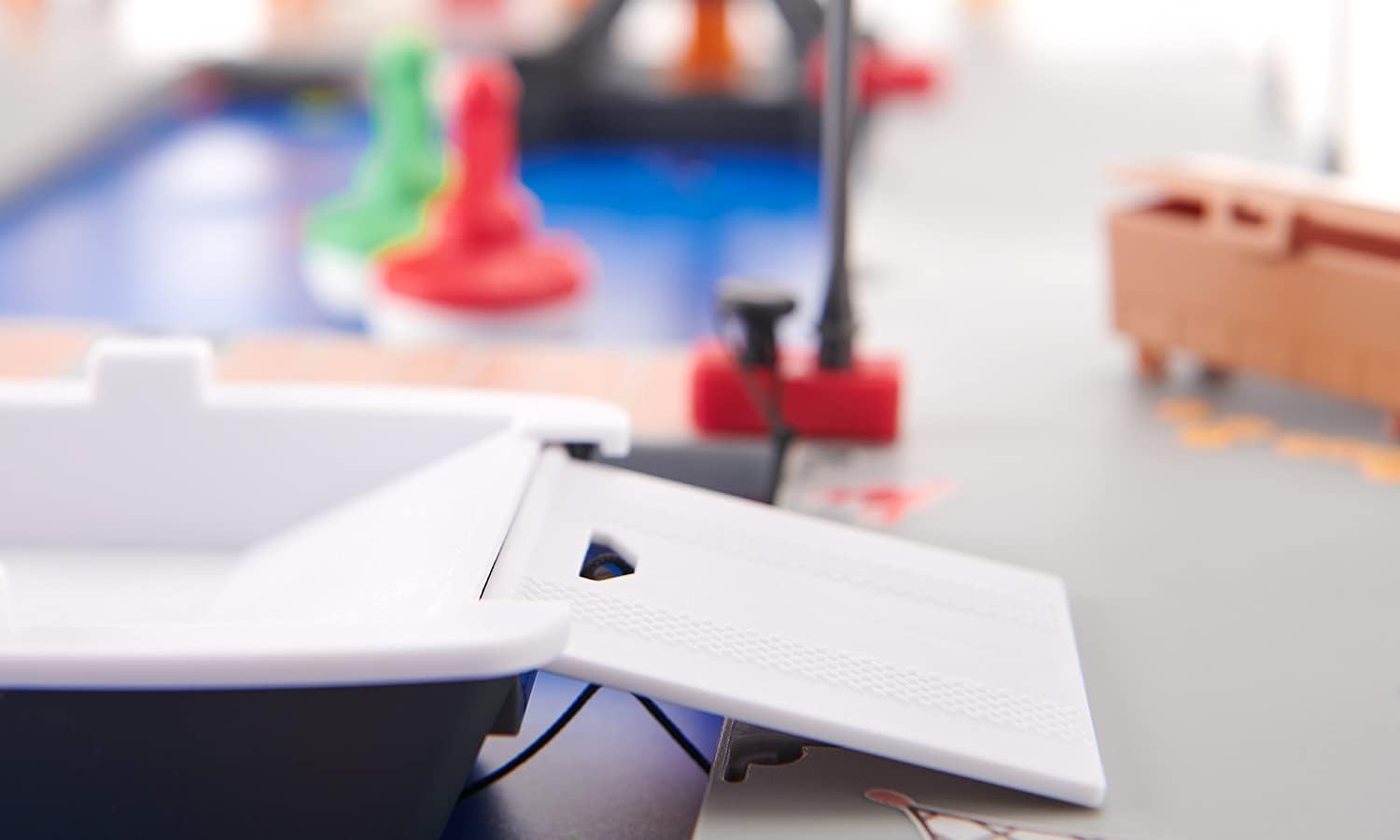 Bogaty zestaw akcesoriów do kreatywnej zabawy: 2 płyty bazowe do łączenia, 1 łódź robocza, 2 boje, 3 flagi, 1 domek na wynos i 1 mostek, 1 dźwig i 1 skrzynia