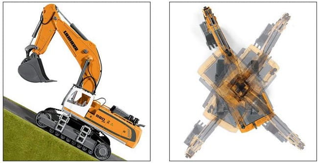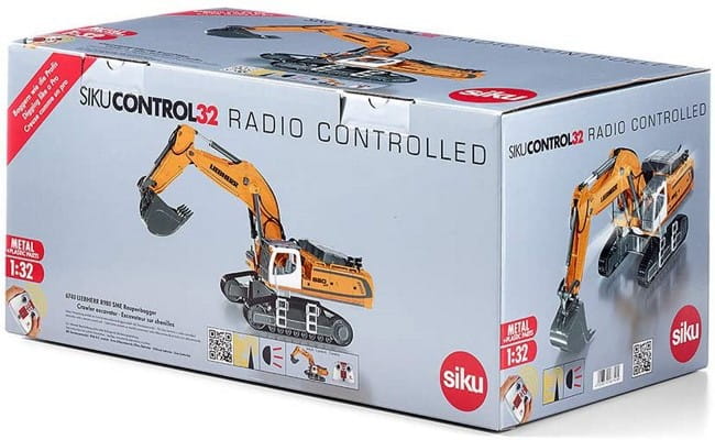 Model ten, wyprodukowany z metalu i tworzywa sztucznego o częstotliwości 2,4 GHz, waży nieco ponad 2 kg. Łącznie sześć sterowanych elektrycznie proporcjonalnych skrzyni biegów o wysokiej mocy pozwala temu monumentalnemu pojazdowi RC pewnie i bezpiecznie kroczyć do celu. Prawa i lewa strona podwozia gąsienicowego są sterowane osobno w sposób zsynchronizowany, co pozwala na swobodne manewrowanie koparką. Nadwozie może obrócić się o więcej niż 360 stopni, ponieważ działa ono bezprzewodowo na nośniku z pierścieniem ślizgowym. Niełatwo jest znaleźć odpowiedź na pytanie, gdzie znajduje się przód koparki, jeżeli podczas intensywnego kopania nadwozie obraca się wielokrotnie. Odpowiedź na to pytanie pomaga jednak znaleźć elektronika. Za pomocą jednego przycisku nadwozie sprowadzane jest do pozycji wyjściowej. Oznacza to wtedy, że przód jest tam, gdzie wskazuje ramię koparki. Ramię koparki sterowane jest w sposób zsynchronizowany za pomocą trzech skrzyni biegów i jest w stanie kopać tak samo, jak wersja oryginalna, nawet poniżej linii podłoża. Tym samym możliwe jest wykopywanie dołów.