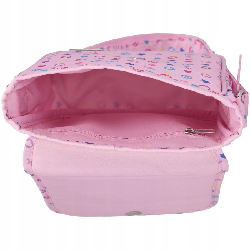Różowa torebka ma piękny motyw pudla na fajnym brokatowym tle i piękny nadruk modnych postaci na całej powierzchni. Z regulowanym paskiem na ramię, zapięciem na magnes i oddzielną kieszenią wewnętrzną. Ładny dodatek: różowy, metalowy wisiorek pudla. Materiał: 100% PES, przód 100% PVC.