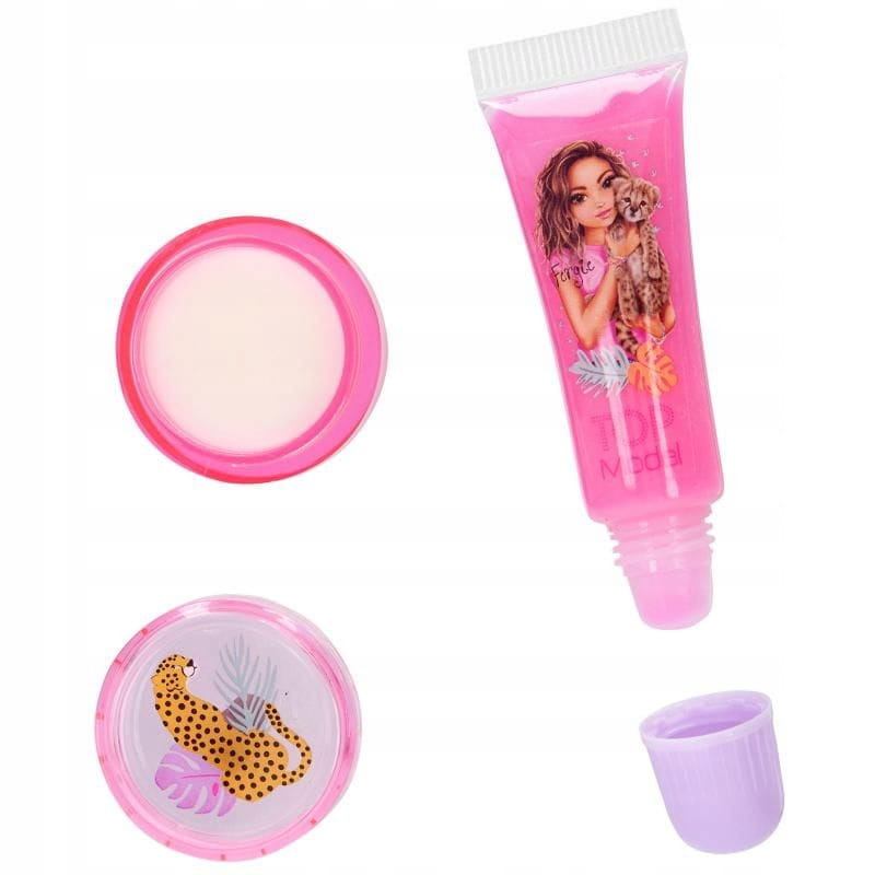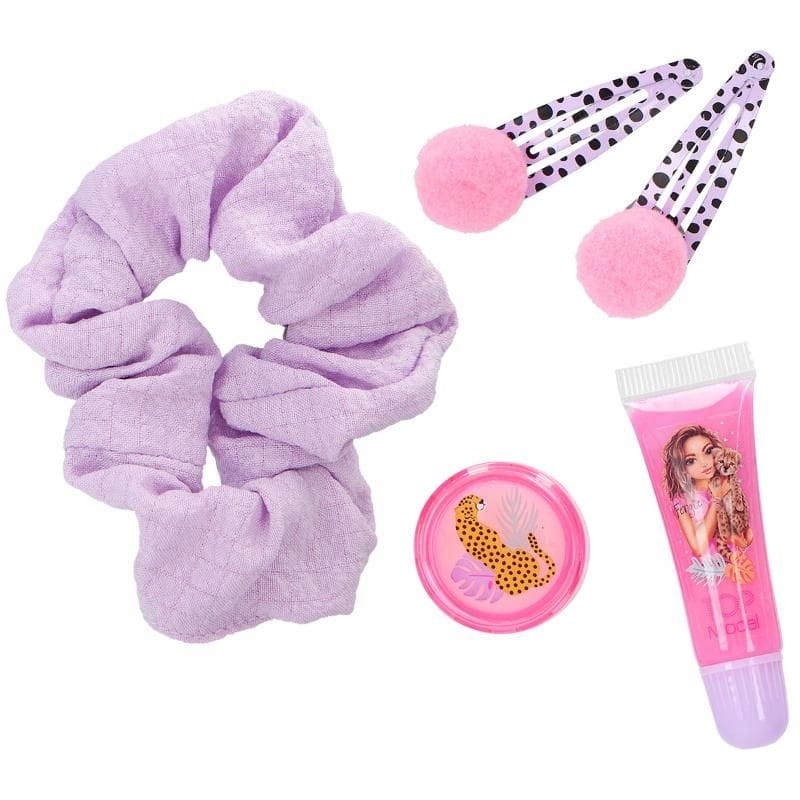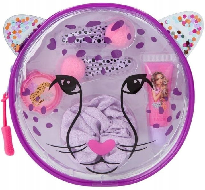 Cóż za uroczy zestaw kosmetyczny: w przezroczystej okrągłej torebce z małymi uszami i nadrukowaną twarzą geparda. W środku znajdują się 2 metalowe spinki do włosów z pomponami, 1 liliowa gumka, 1 błyszczyk o zapachu jabłka (puszka, zawartość 2,8 g) i różowy błyszczyk o zapachu jagody (tubka, zawartość 5 ml).