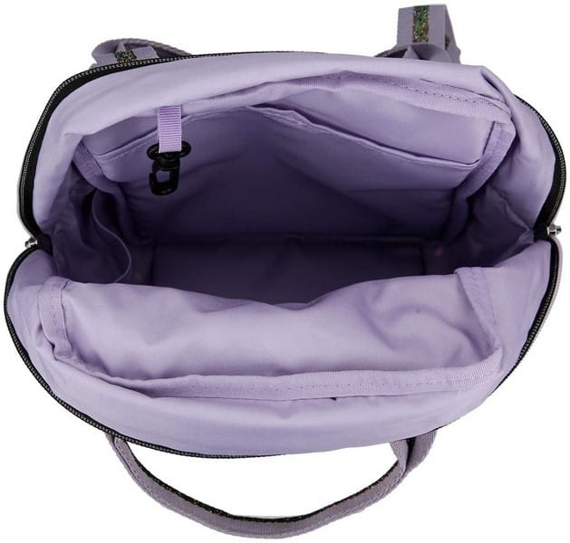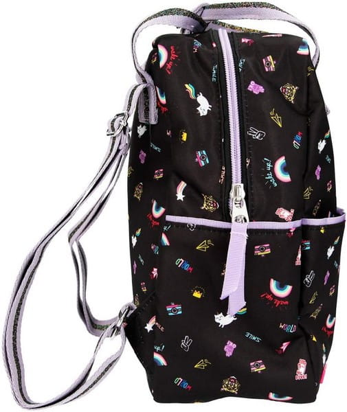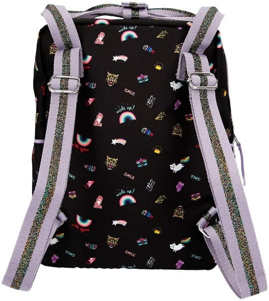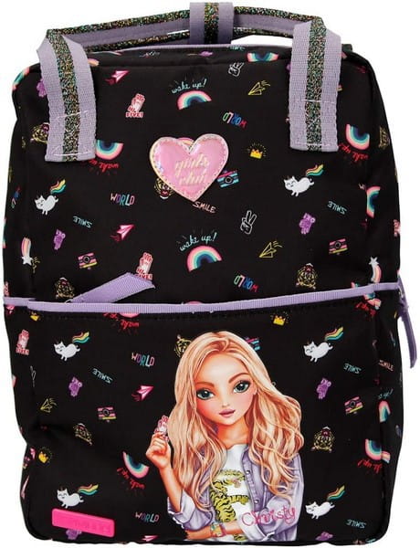 TOPModel „Girlz Club”. Dopasowany mały plecak posiada przestronną komorę główną z wewnętrzną kieszenią i małą przednią kieszeń zapinaną na zamek. Paski w paski z brokatem mają regulowaną długość. Materiał: 100% poliester