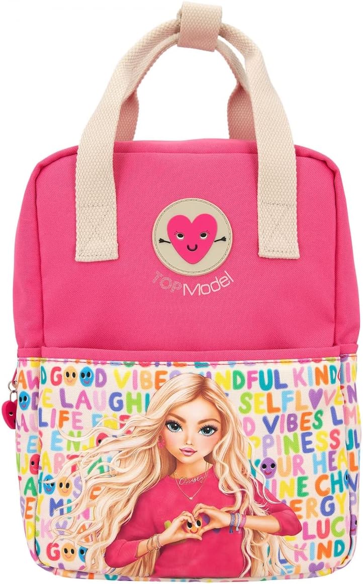 Wzór: TOPModel SelfLove by Depesche - w wyrazistym różu, z nadrukiem modeli, kolorowym wzorem czcionki na białym tle, zawieszka w kształcie serca i łatka